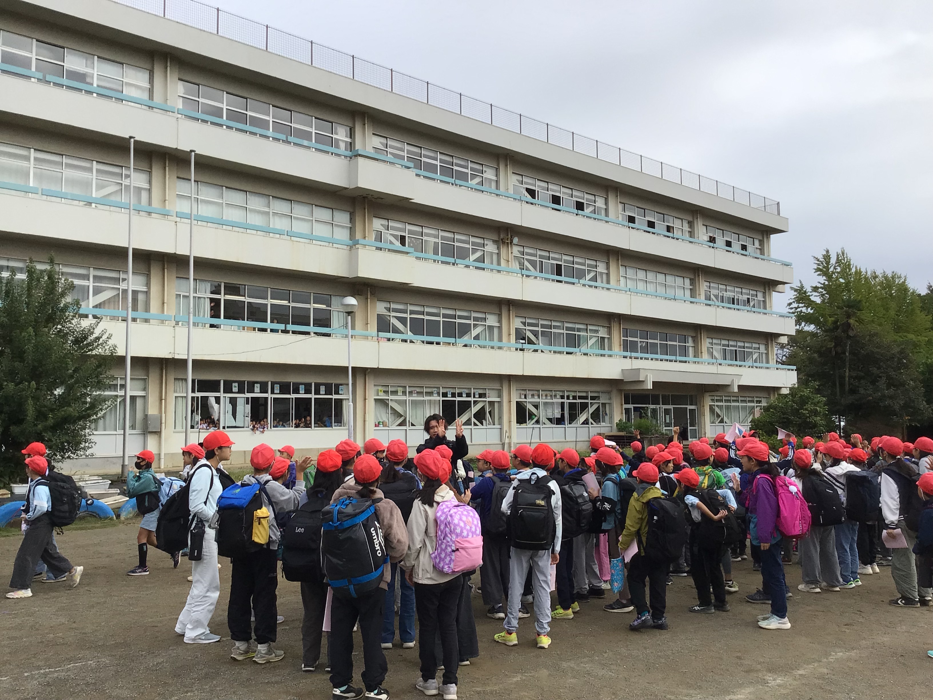 いよいよ5年生が出発します。校舎に向かって「行ってきま〜す!」