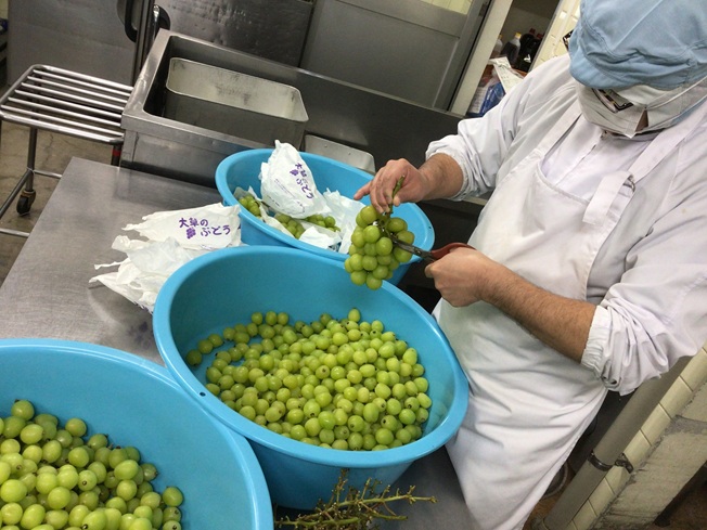・シャインマスカットは、一粒一粒鋏で切ったあと、3回洗ってからクラスの人数で食缶に入れていきます。旬の果物を味わって食べましょう。