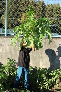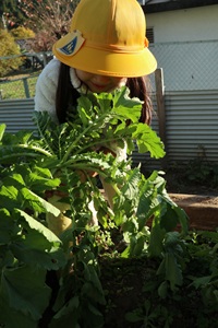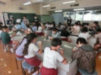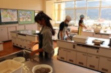 二小の畑で採れた野菜を使って、6年生が豚汁をつくりました。業間休みに、全校児童が家庭科室に集まって、できた豚汁を食べました。