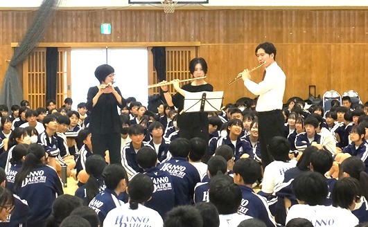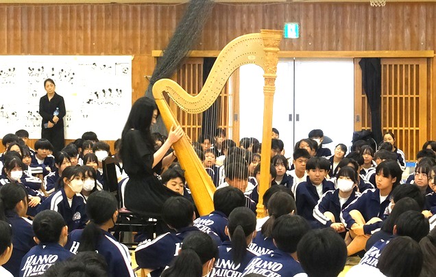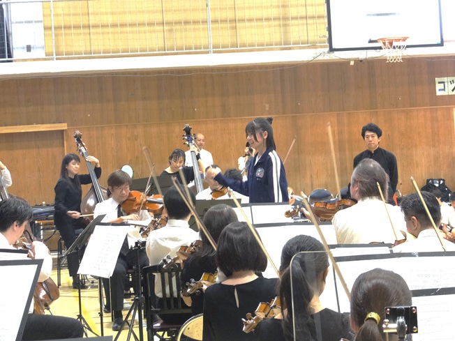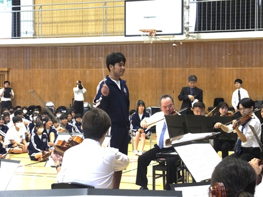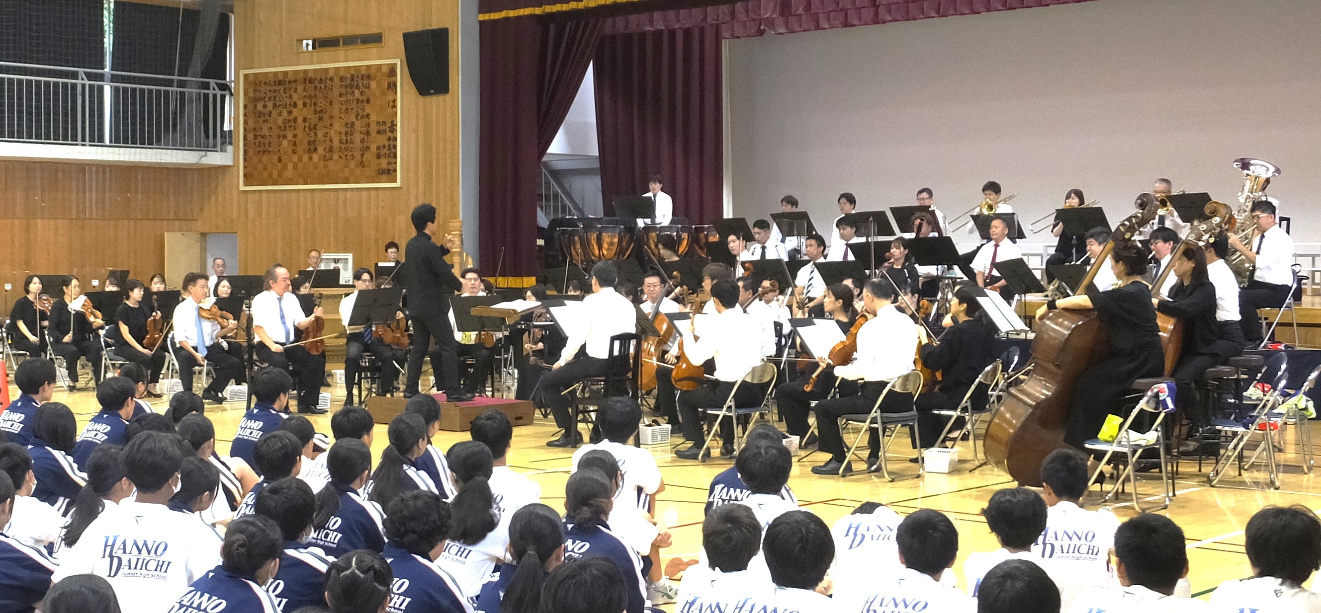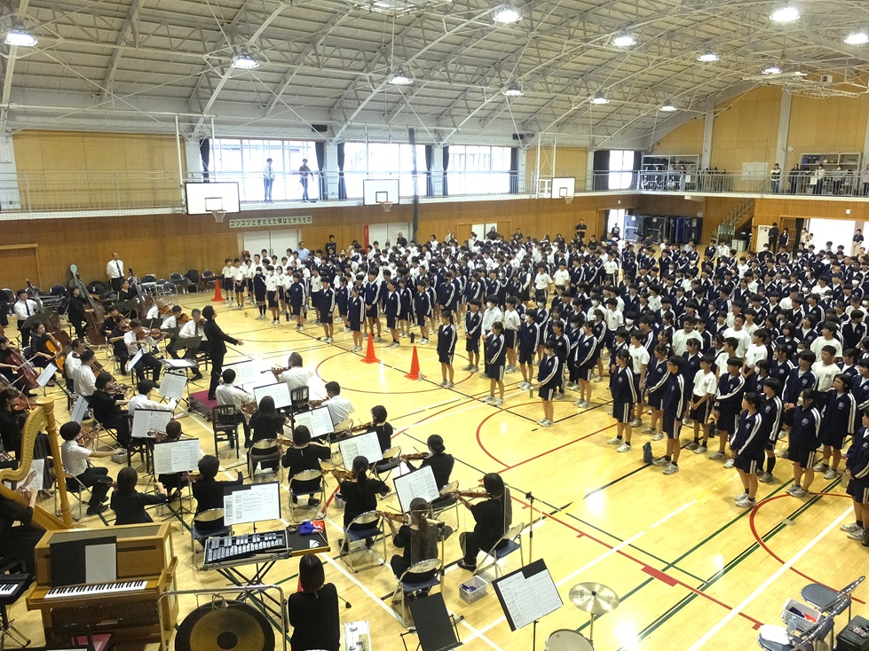 一昨日8日、山形県を拠点に活動するプロのオーケストラ、山形交響楽団の皆さんに演奏していただきました。これは文化庁の舞台芸術等総合支援事業に応募して行ったものです。今回演奏してくださった山形交響楽団は1972年に設立された東北地方を代表する楽団のひとつです。60名を超える楽団員による迫力ある演奏でした。最前列の生徒は演奏家からわずか2mの距離での鑑賞は迫力満点でした。ベートーベンやチャイコフスキーによるクラシックの名曲だけでなく、それぞれの学期の音色を聴き比べるコーナーでは生徒にもおなじみのゲームのBGMで楽しませてくれました。また、2名の生徒が代表としてハンガリー舞曲第5番の指揮に挑戦しました。オーケストラ用にアレンジした一中校歌の演奏もあり、音楽科の先生の指揮で楽団と生徒が一緒に演奏、合唱しました。子どもたちは皆「すごかった!」と感激していました。