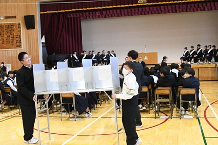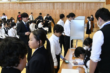 昨日、生徒会本部役員選挙を行いました。飯能第一中学校をより良い学校にする、その主体は生徒自身です。生徒会選挙はその先導役を決めるもので大変重要です。今年は会長に3人、役員に7人が立候補し、これまで選挙運動を行ってきました。初めに立候補者とその推薦人が演説し、投票と続きました。どの立候補者も推薦人も大変立派に考えを発表しました。また、昨年に続き今年も飯能市選挙管理委員会から本物の投票箱と記載台をお借りして行いました。これまでの準備そして当日の運営を行った選挙管理委員の子どもたちの腕章も本物です。選挙管理委員の子どもたちが放課後、開票作業を行いました。気になる結果は火曜日に掲示されます。