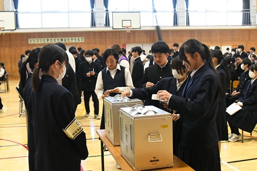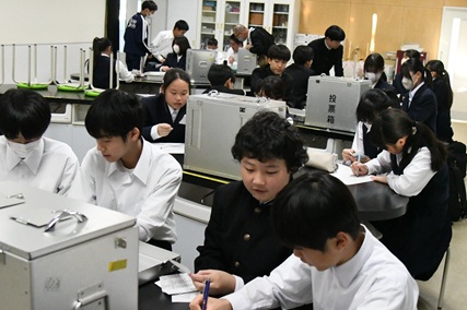 昨日、3年生社会科公民分野の学習として模擬選挙を行いました。架空の政党から立候補した立候補者(教員)の政策を選挙公報から読み取り、誰に投票するかを考えて投票します。飯能市選挙管理委員会から実際の選挙で使われる投票箱をお借りして行いました。また、選挙管理委員会を生徒から募集して構成して運営しました。更に開票作業は飯能市選挙管理委員会の事務局の方にお越しいただき、実際の開票作業について教えていただきながら行いました。投票する生徒も選挙管理委員会の生徒の実際に近いかたちで緊張感をもって模擬選挙に臨んでいましたた。