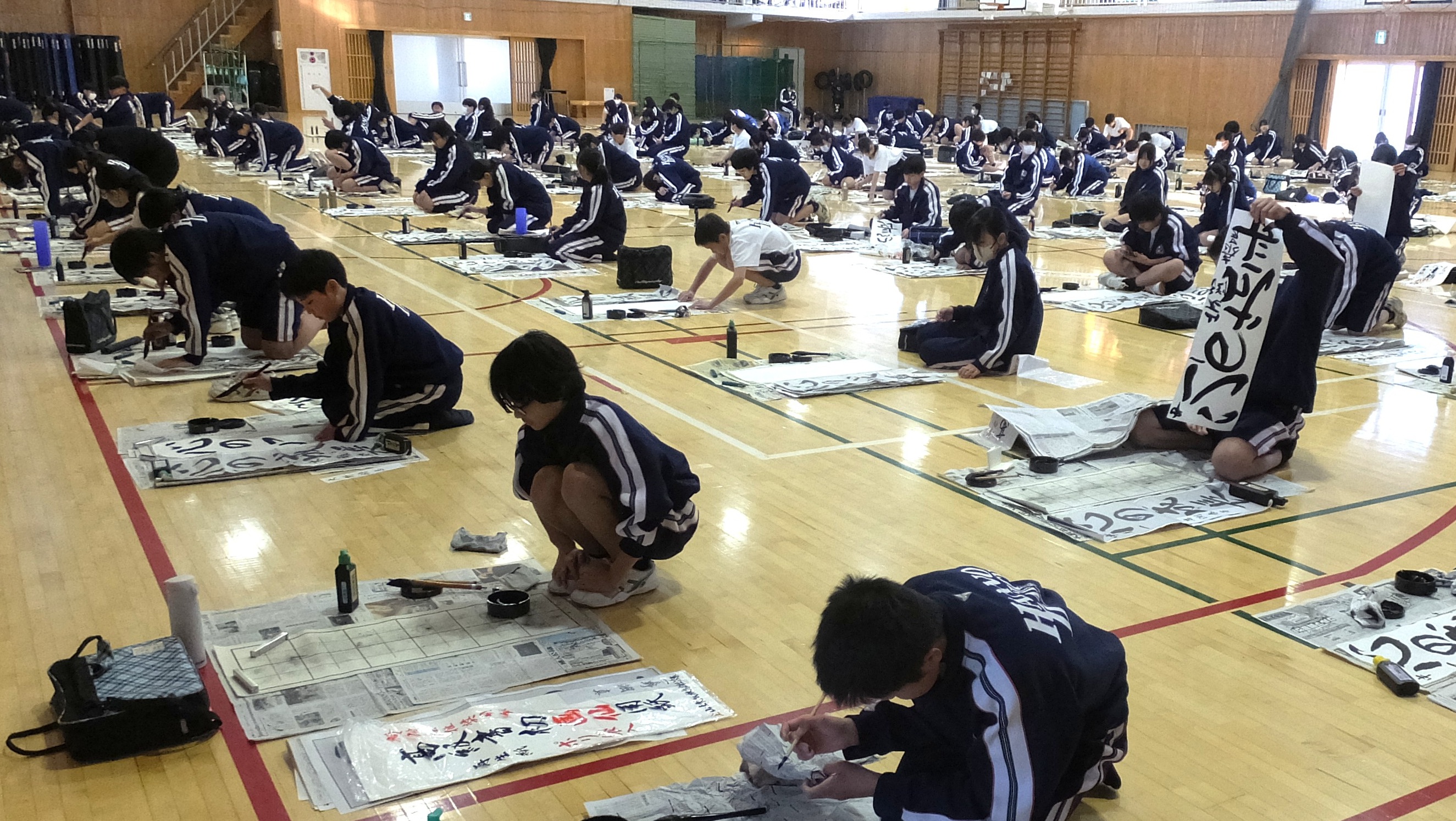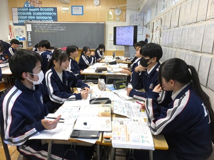 1年生は体育館で書初めです。皆真剣な表情で取り組んでいます。3年生は受験前でも浮き足立つことなく、粛々と課題に取り組んでいます。数学は入試レベルの難問に挑戦し、社会は金融の仕組みについて探究していました。