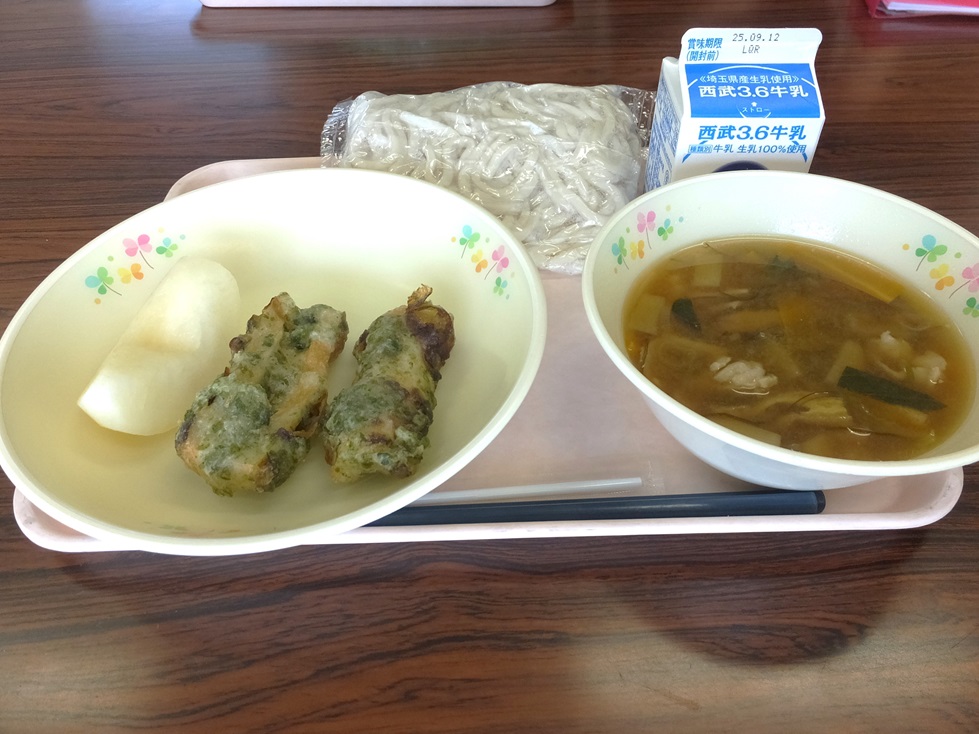 今日の千草うどん、とてもおいしかったですね。竹輪の磯辺揚げも最高でした。そして、瑞々しくて甘い飯能産の梨。もう言うことなしです。