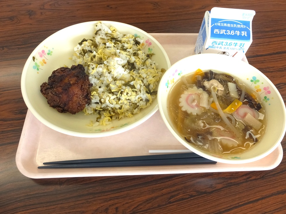 熊本県の郷土料理、高菜飯の初登場です。(HP担当の家では高菜ピラフと呼んでいます)おいしかった!鶏肉の塩こうじから揚げも最高!