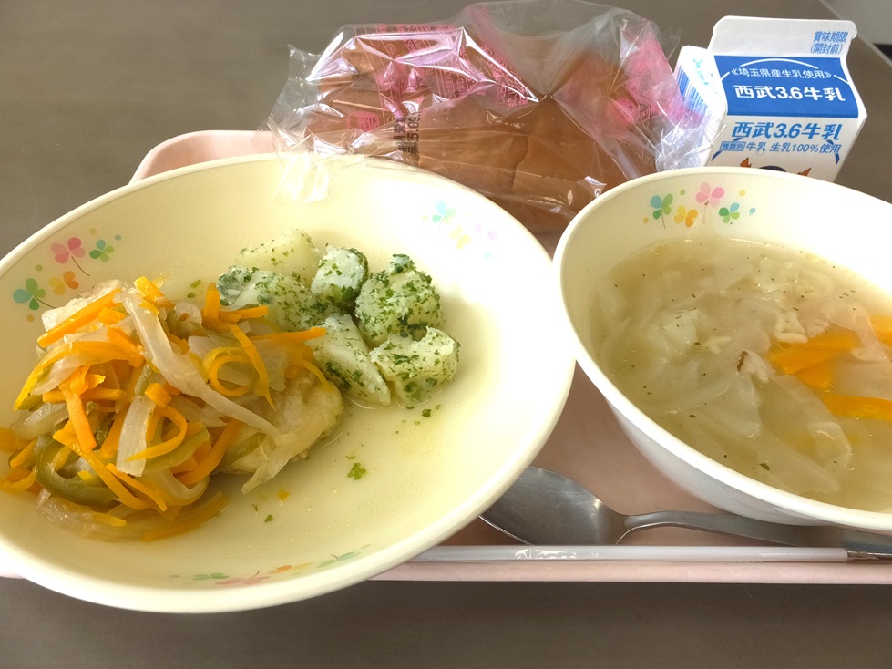 黒パン 白身魚のマリネ ABCパスタスープ 粉ふきいも