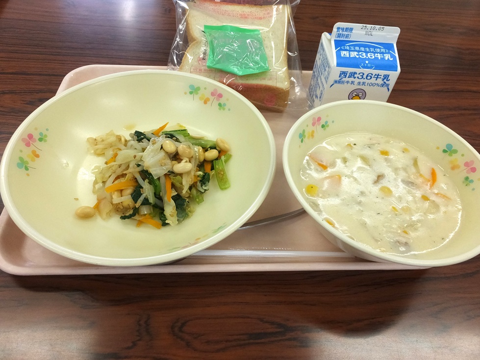 コーンチャウダーがおいしい季節になりました。大豆入りごまサラダもさっぱりしていておいしかったです。