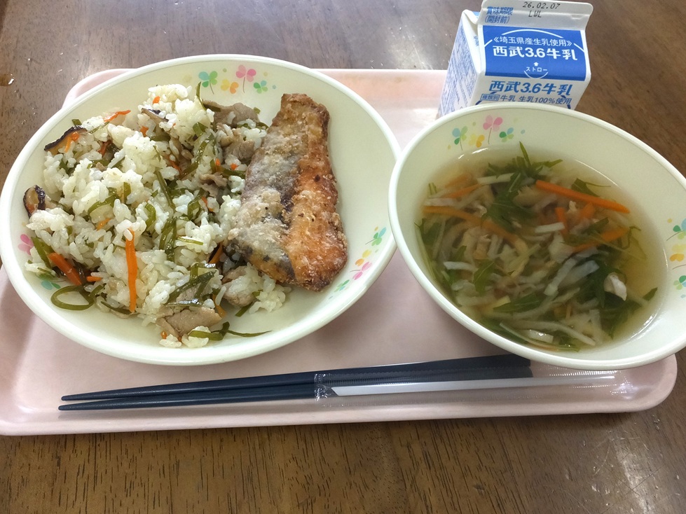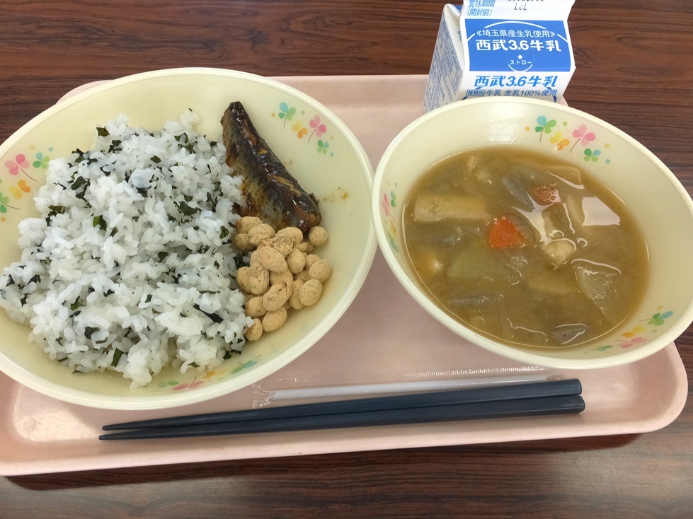 今日のメニューは豚肉やひじきを豚の茹で汁で炊き込んだ沖縄県の郷土料理「ジューシー」でした。本日、授業研究の指導者でお世話になった東京大学名誉教授の佐藤学先生も絶賛でした!