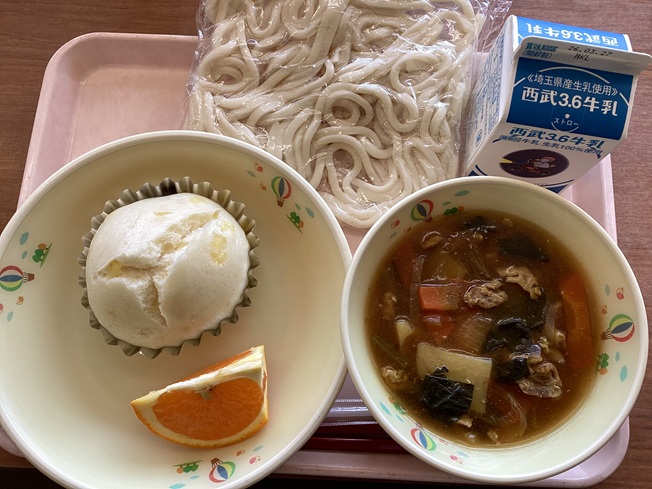 ・野菜たっぷりのカレー南蛮です。めん料理単品では野菜を食べる量が少なくなりがちですが、つゆの中に様々な野菜が入っていると、無理なく野菜を食べることができます。