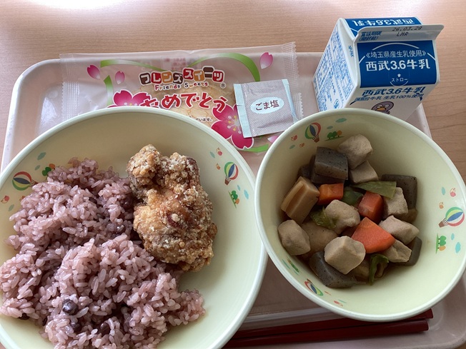 ・給食最終日の今日は「お祝い献立」です。赤飯は伝統的なお祝い料理で、幸運を呼び込む意味があるそうです。6年生は富士見小での最後の給食です。みんなで楽しんで食べられましたか?