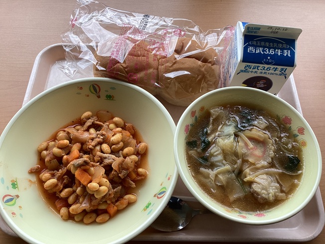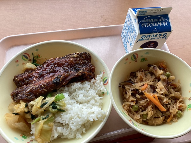 ・揚げた秋刀魚に長ネギや豆板醤で調理したピリ辛のタレを絡めます。ご飯がすすむおかずです。10月は【食品ロス削減月間】です。給食に限らず、食品ロスを減らすために一人一人ができることをしていきましょう。
