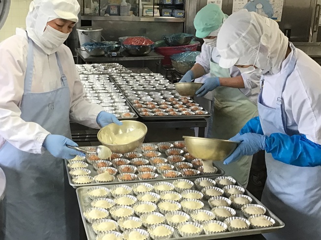 ・今日の給食は「カップ肉まん」です。 アルミのカップに肉だねを入れ、その上に肉まんの皮の部分となるタネを流し込み蒸し上げます。