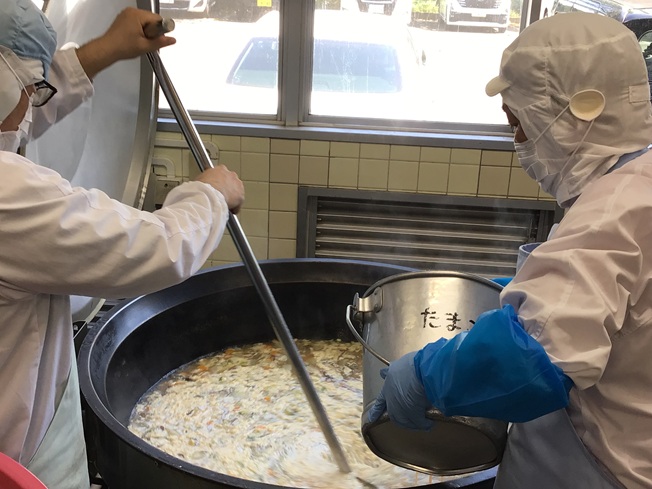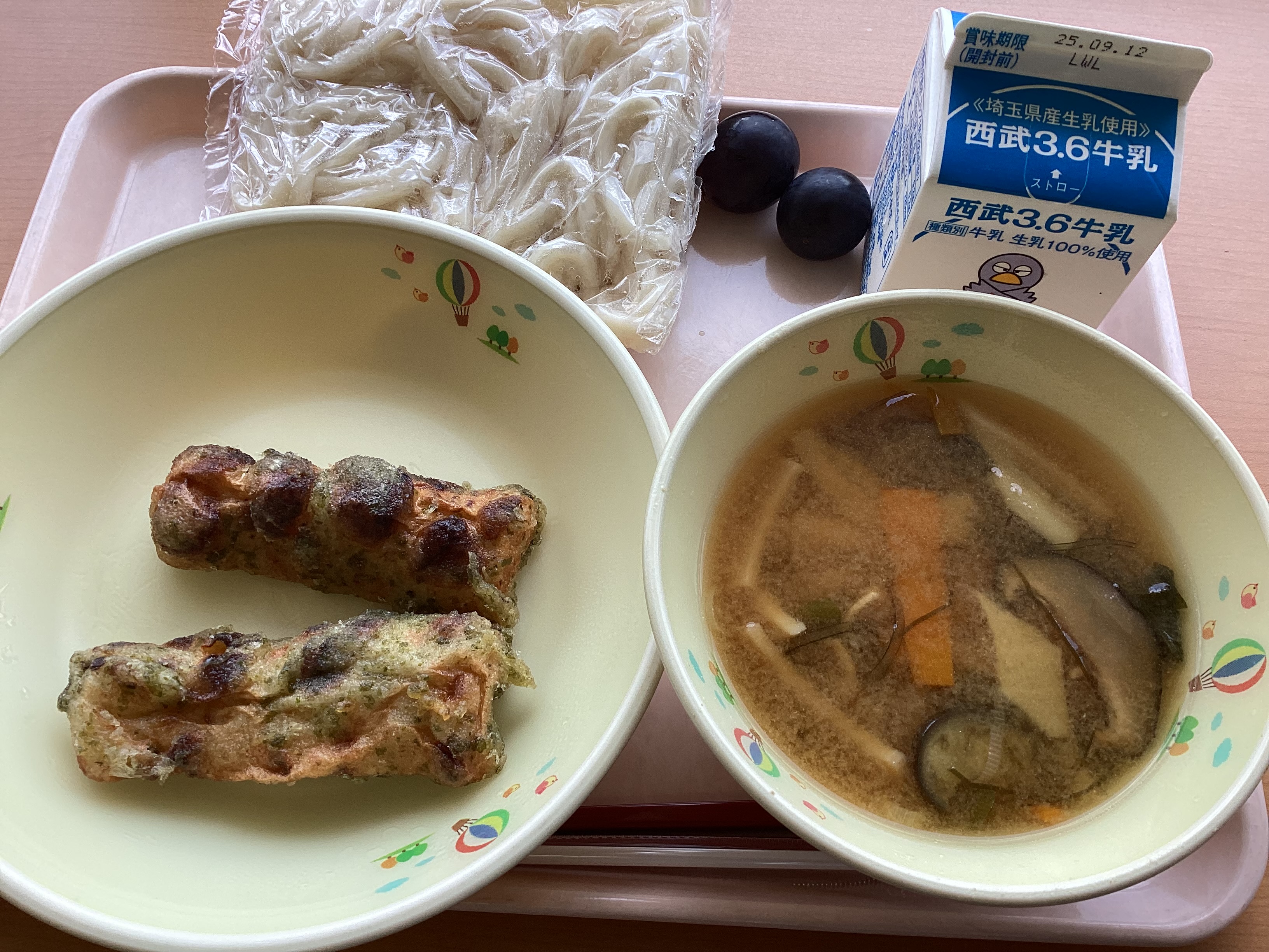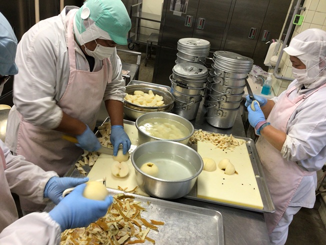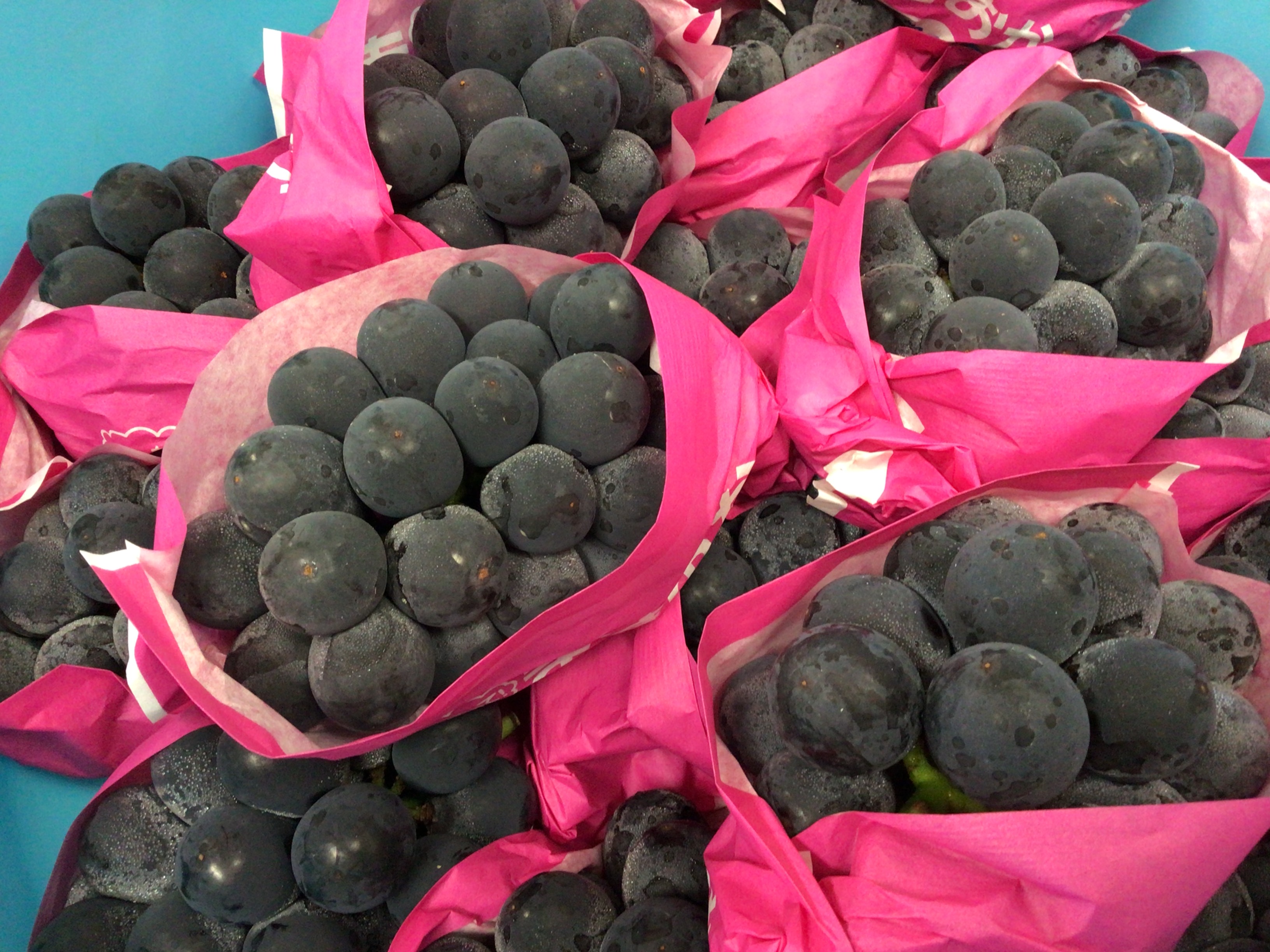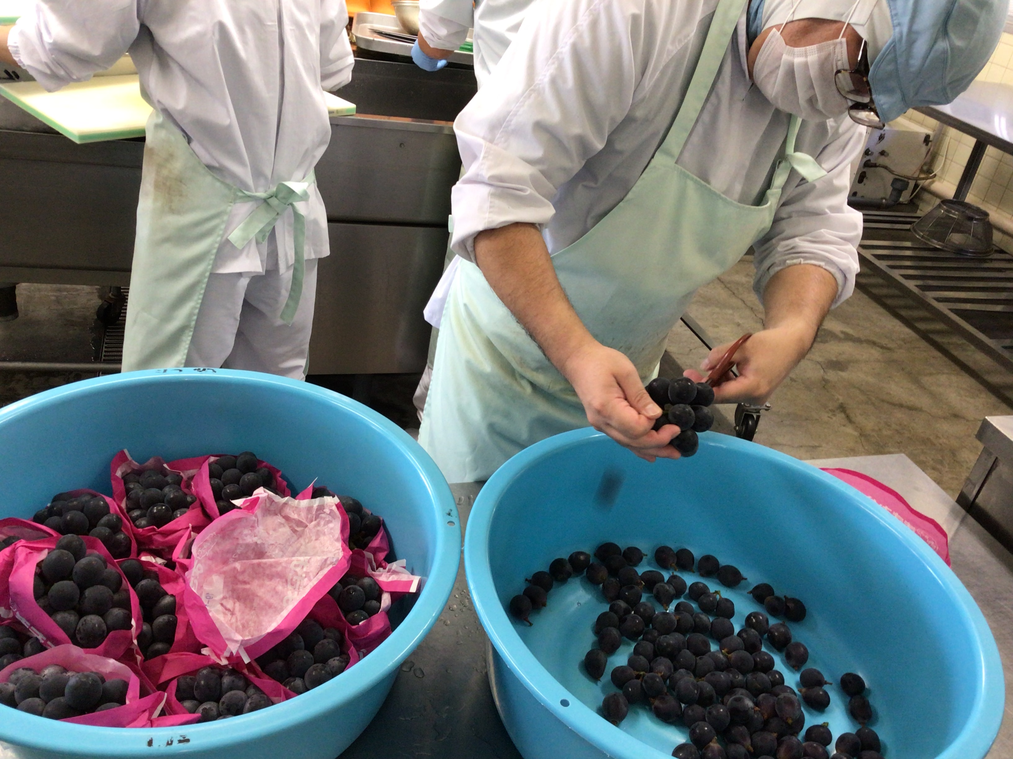 ・今日のブドウは山梨県産です。土手も甘いぶどうでした。ぶどうは一人2粒ずつ、約540人分を調理員さんが一粒ずつ鋏で切ってくれました。