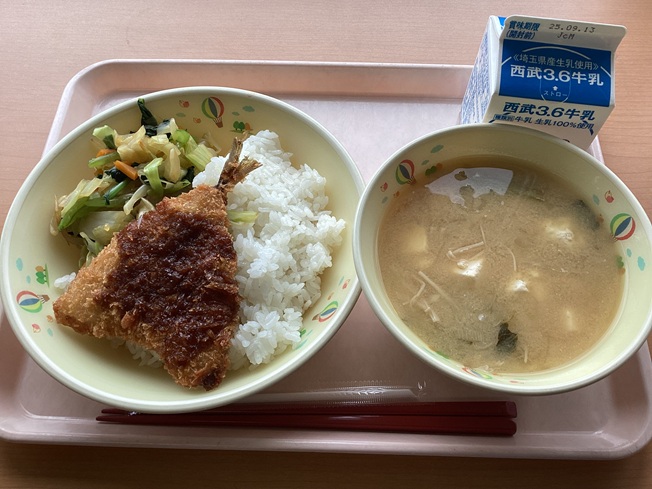 ・鰺フライはサクサクな食感が美味しく食べました。 味噌汁は、とうふ、えのき、切り干し大根、ねぎ、具だくさんです。
