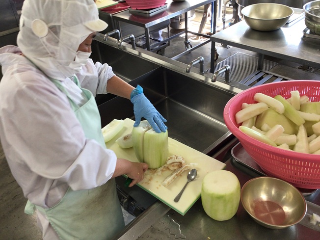 ・茨城県産の冬瓜でスープを作りました。冬の瓜と書きますですが、旬は夏です。23キロを食べやすいサイズに切り使用しました。