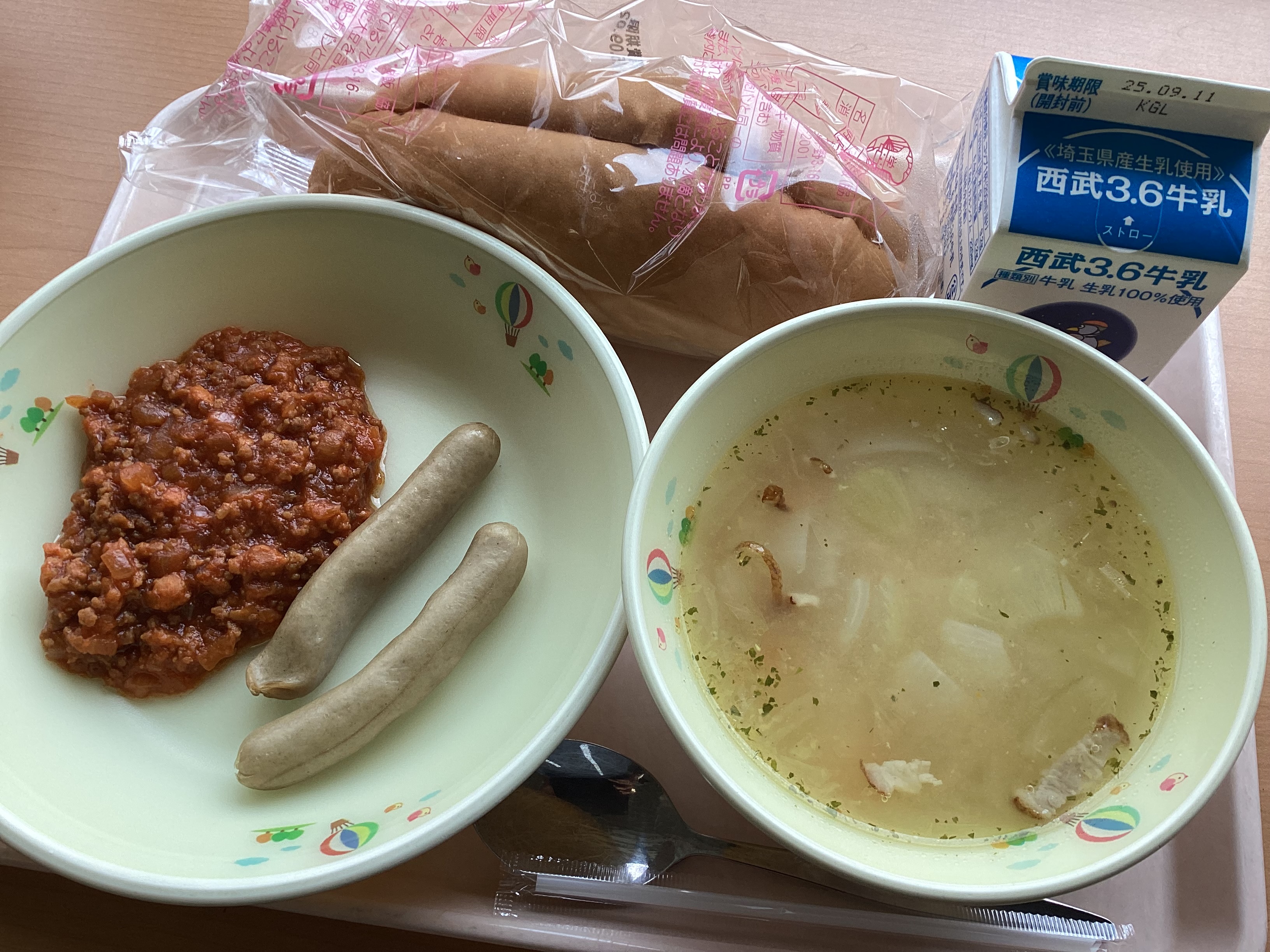 ・待ち遠しかった給食の再開です。スライスの入ったコッペパンに、ウインナーとチリソースを挟んでチリドックにします。とっても美味しいです。