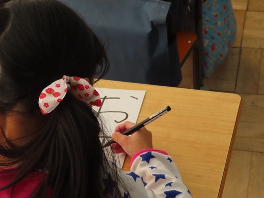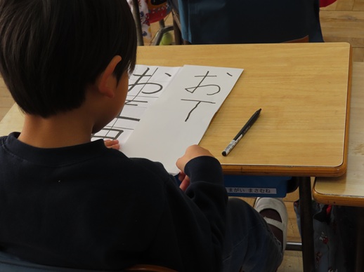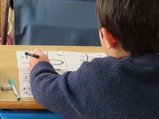 お手本を見ながら、一文字一文字に集中し、筆順に気を配りながら一生懸命に書いています。