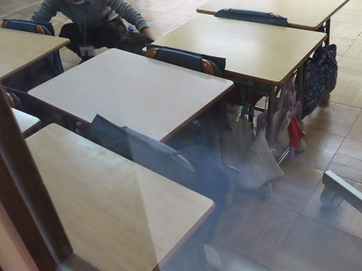 万が一、不審者に侵入されてしまったら、職員の指示に従って教室のドアを閉め、机でバリケードを築き、机の下に身を隠します。