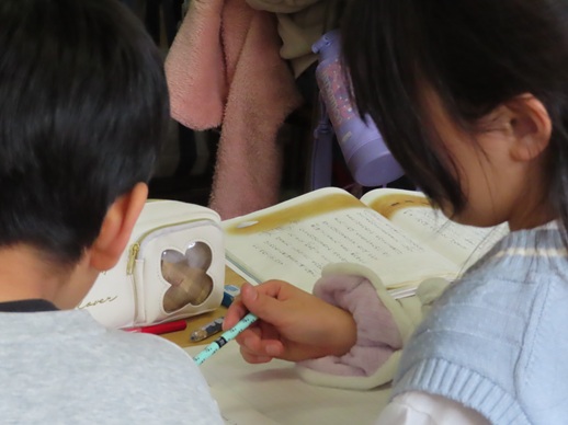 ペアでの句点読みから始まり、担任から出された課題をペアやグループで話し合い・聞き合いしながら答えを見つけ出していきます。