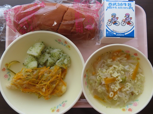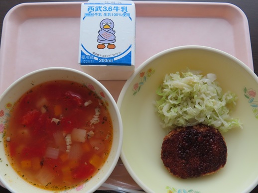 今日の給食では、ベーコン・にんにく・セロリ・玉ねぎ・人参・ジャガイモ・トマト・パセリ・マカロニの9種類の具が入っています。