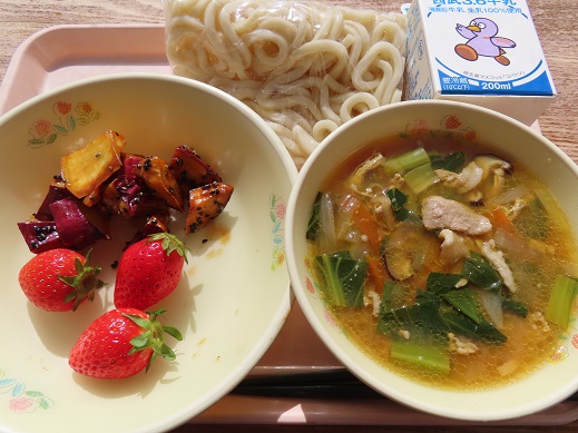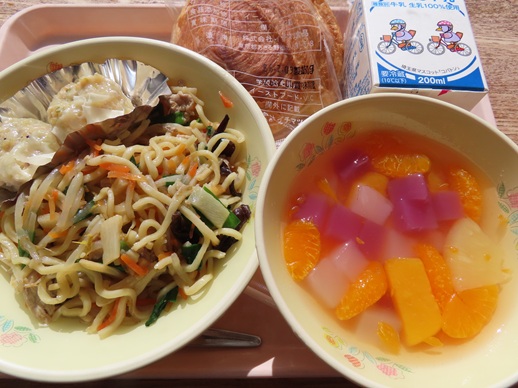 今日は、もやし、キャベツ、ニンジン、青梗菜、きくらげ、春雨を給食室で手作りした中華ドレッシングで和えてあります。
