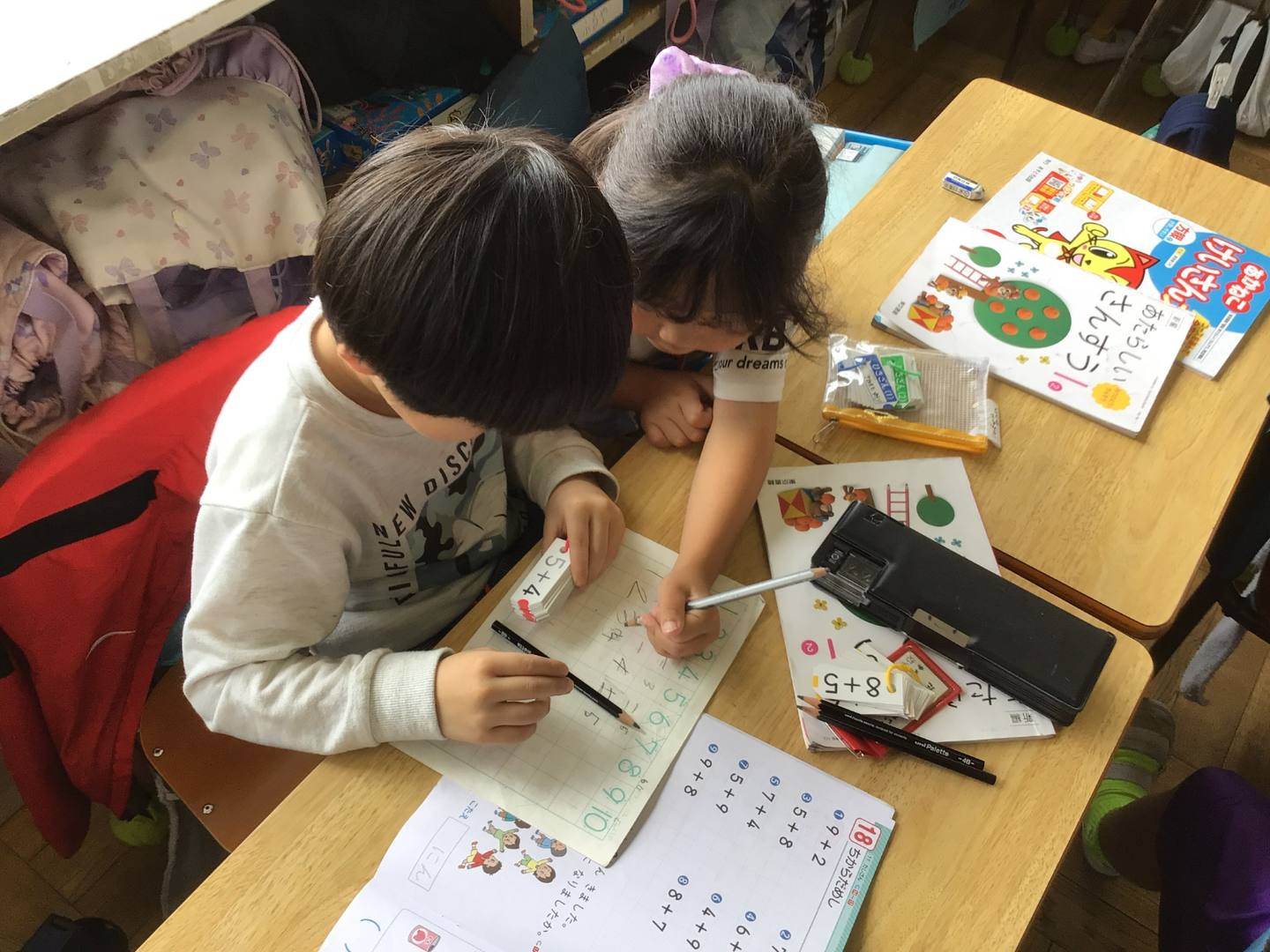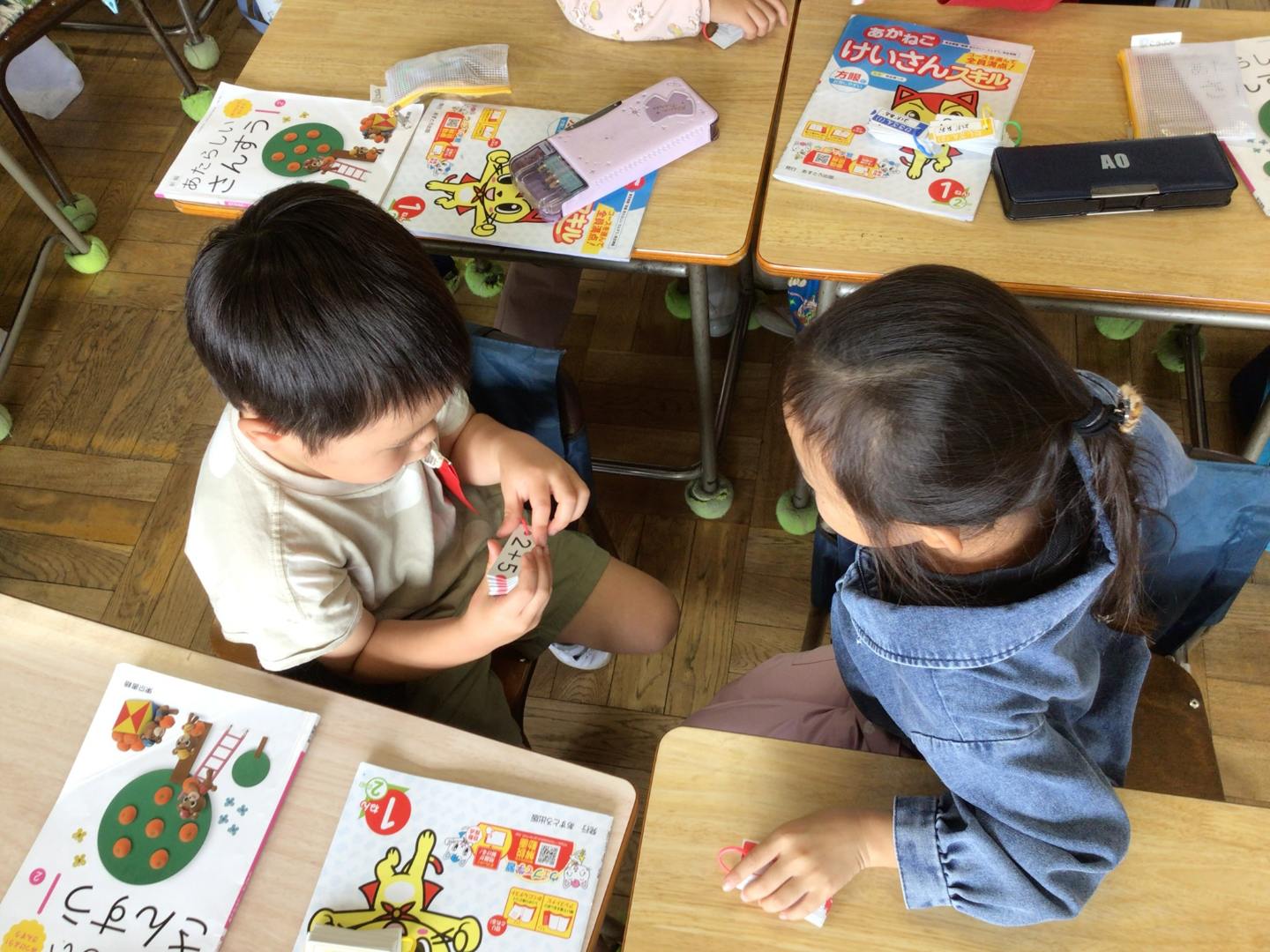 運動会の練習が毎日のようにある中ですが、1年生の教室ではペアで計算カードを使って、たし算の確かめをしていました。計算をする人と答えの確認をする人と交代で行います。友達と楽しみながら学びが進んでいます。