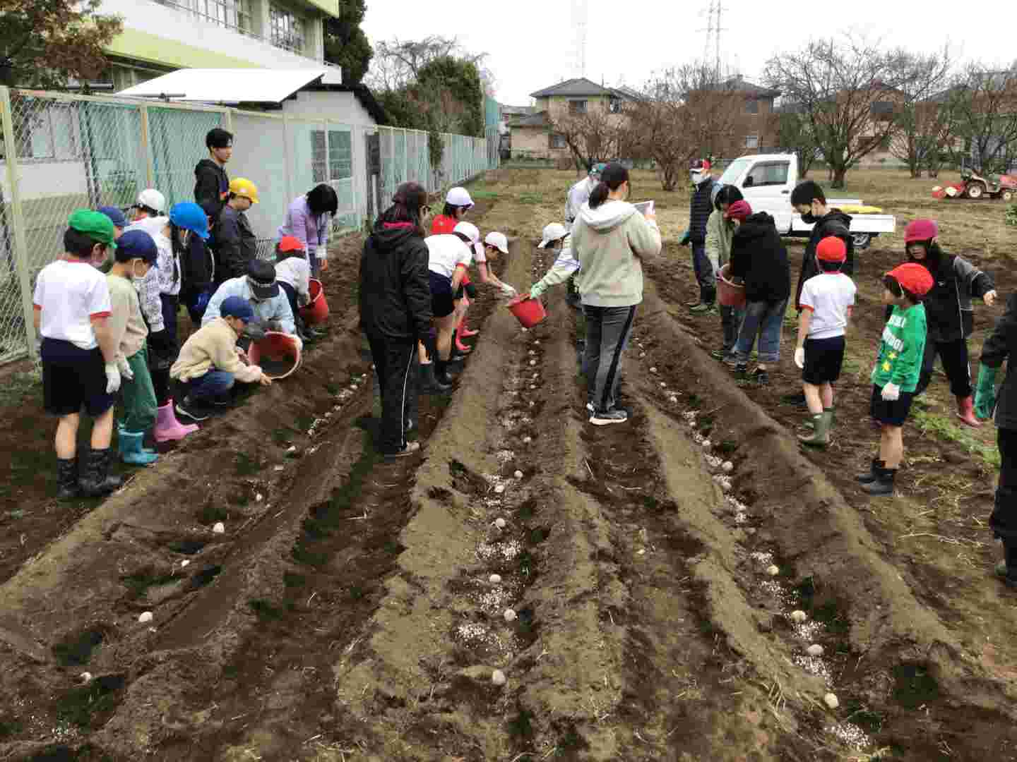 校舎南側の農園では、あすなろ学級の児童がジャガイモの種植えをしていました。みんなで協力して取り組んでいました。校庭では、5年生がホッケーの体験授業をしていました。初めての児童が多く難しそうでしたが、いい顔をしていました。
