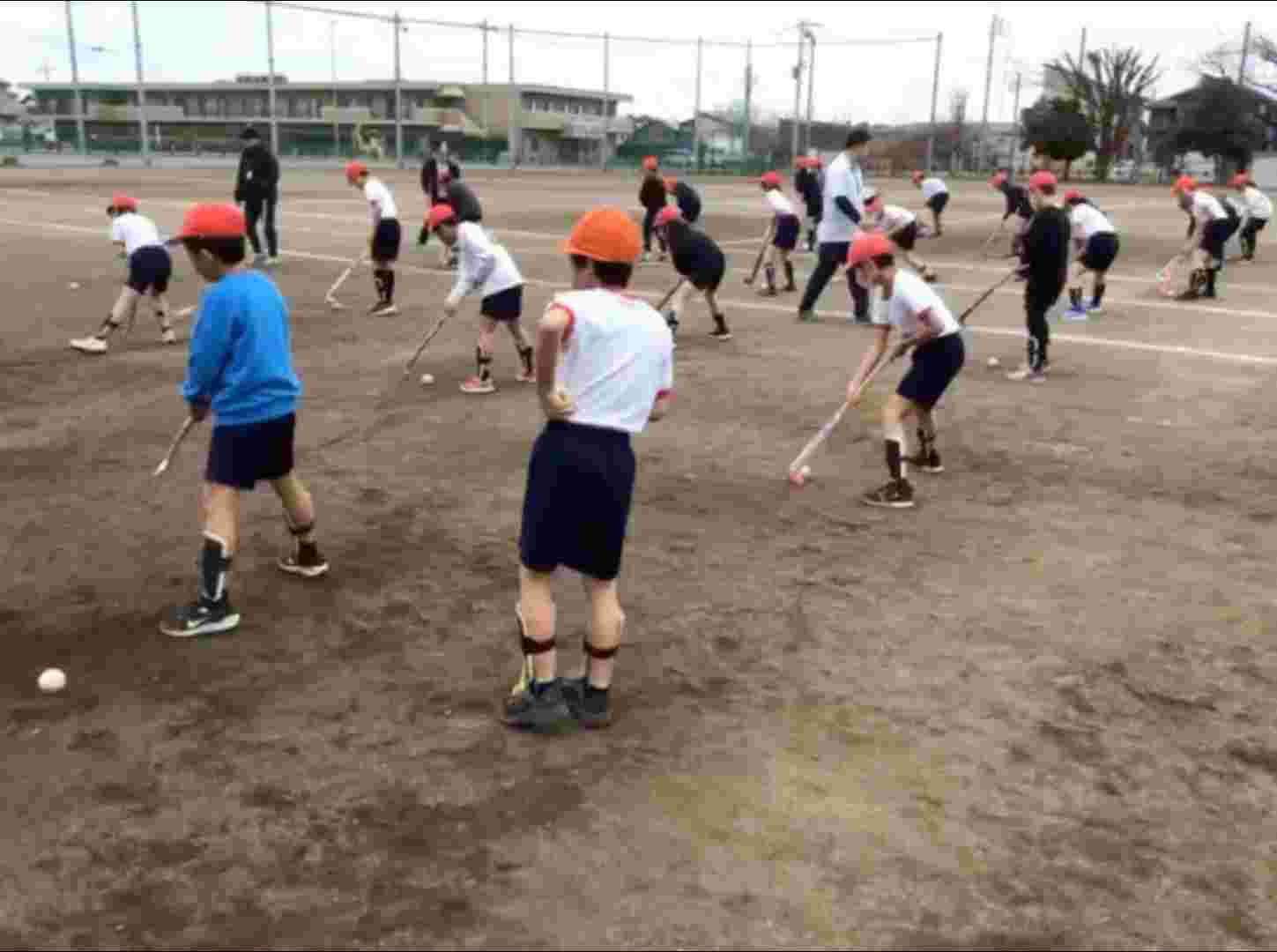 2校時、校庭で5年生がホッケー教室を行っていました。基礎から少し発展し、広い場所を使ってドリブルの練習をしていました。