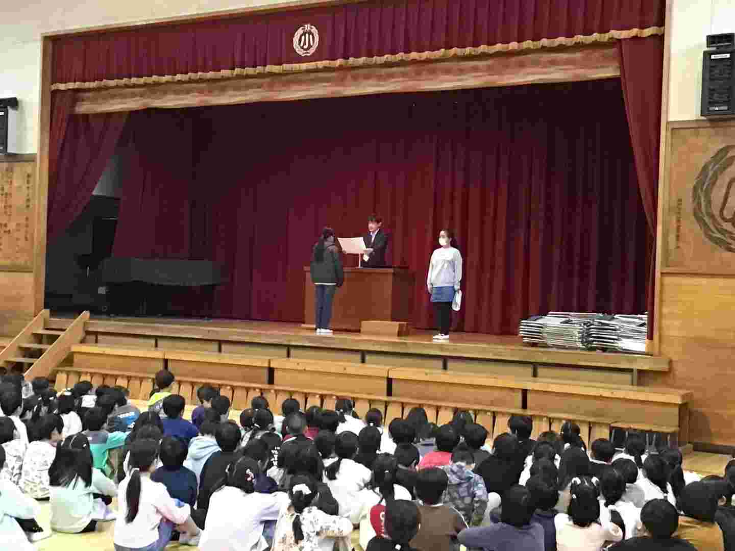 朝の時間、今年度最後のお話朝会を体育館で行いました。カタツムリの話から、「歩みは遅くても一歩一歩進んでいけばいいのであって、あきらめず努力をしてほしい。」と伝えました。その後、今月の生活目標について5年生が〇×クイズ形式で発表しました。きっと、今月の目標であるすてきな姿を広げてくれることでしょう。