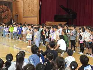 全校児童が体育館に集まり、1年生を迎える会が行われました。6年生と手をつないで入場し、全校で校歌を歌いました。
