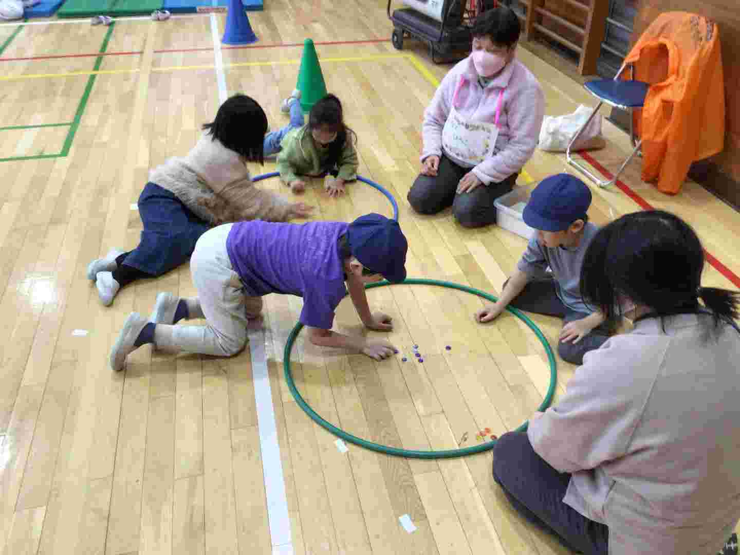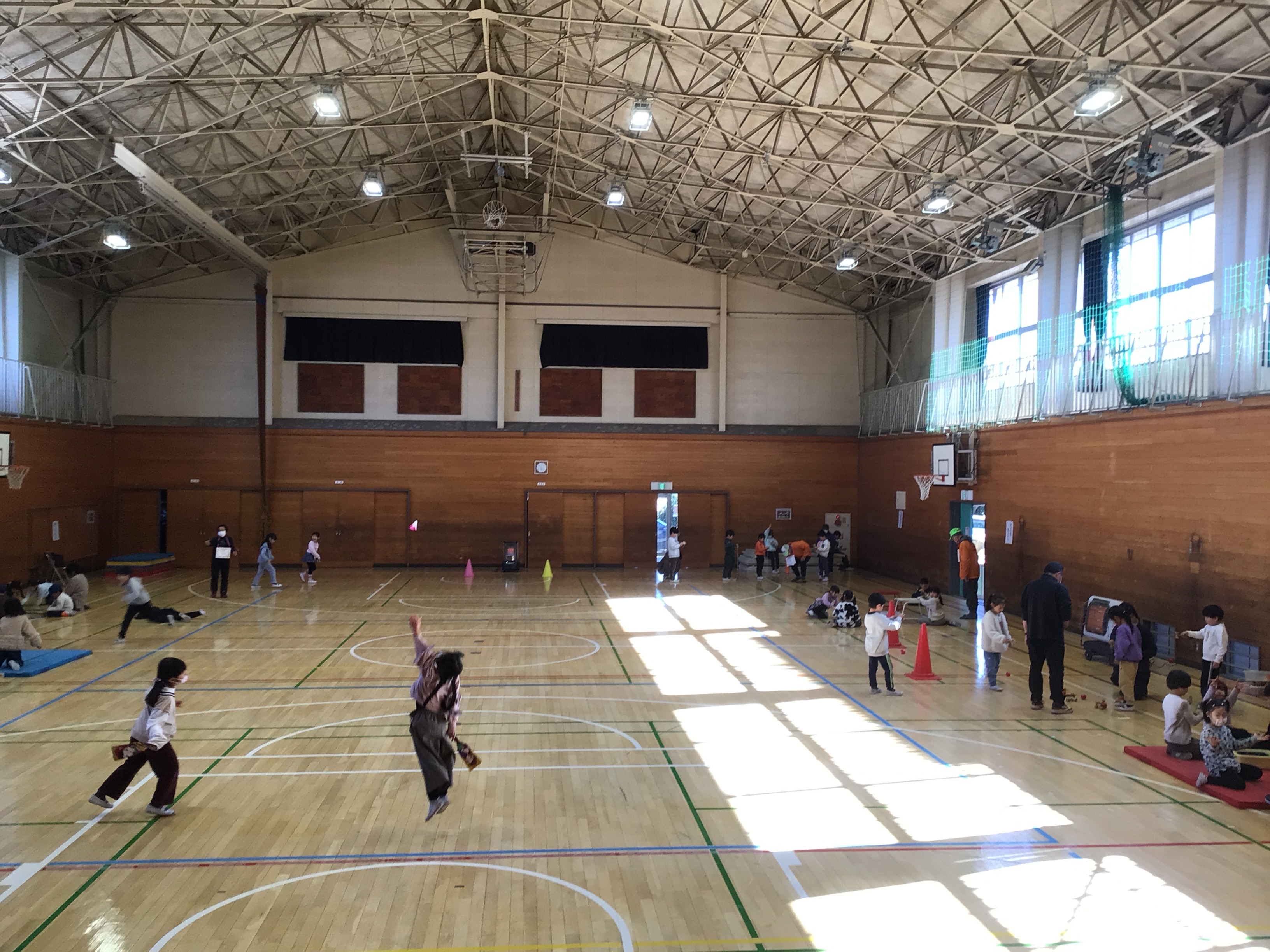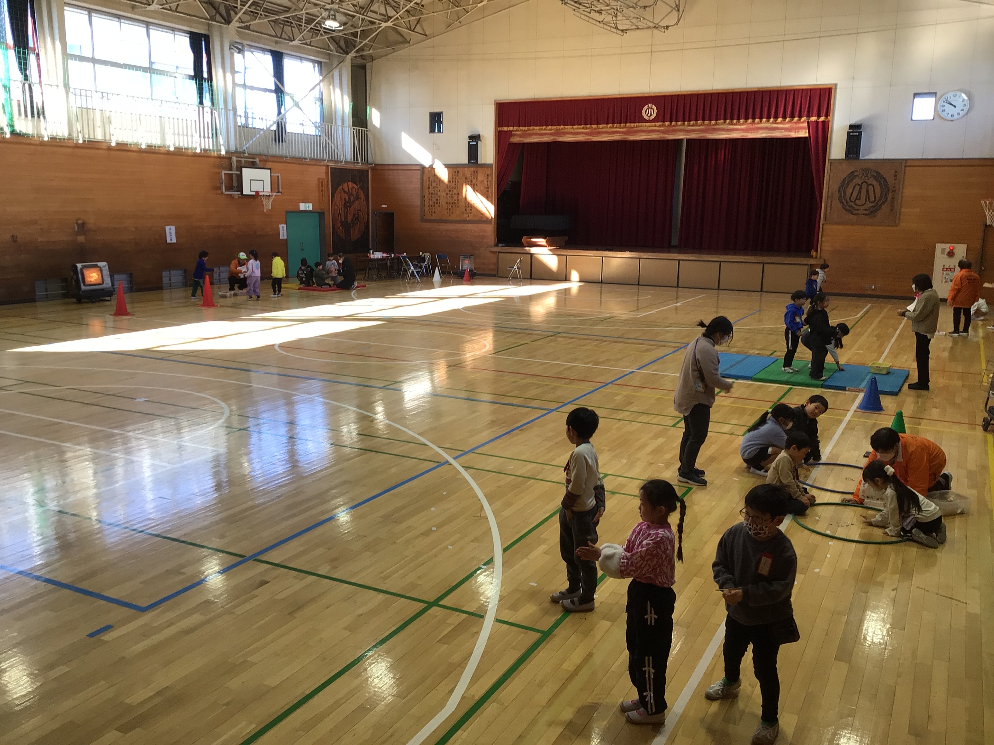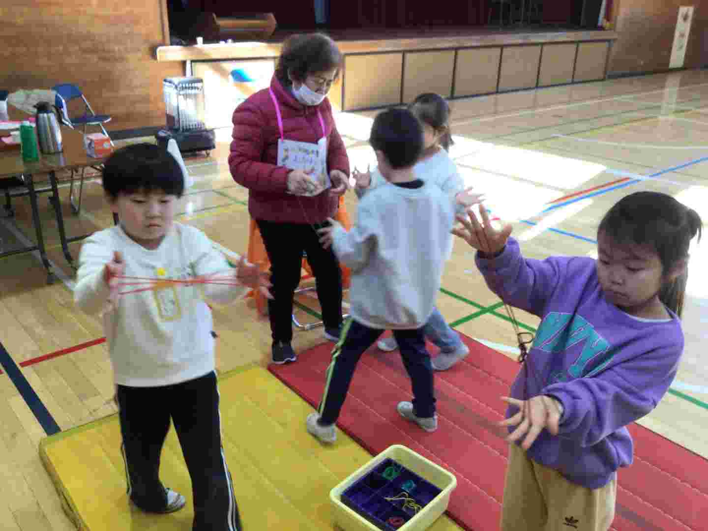 体育館では、1年生が地域の方から昔遊びを教えていただきました。コマ回し、あやとり、けん玉、羽子板、だるま落とし、おはじき、お手玉などを楽しみました。昼休みには、避難訓練を行いました。児童は校庭や教室、図書室など、色々な場所にいましたが、先生がいなくても「自分の命は自分で守る」行動をとることができました。