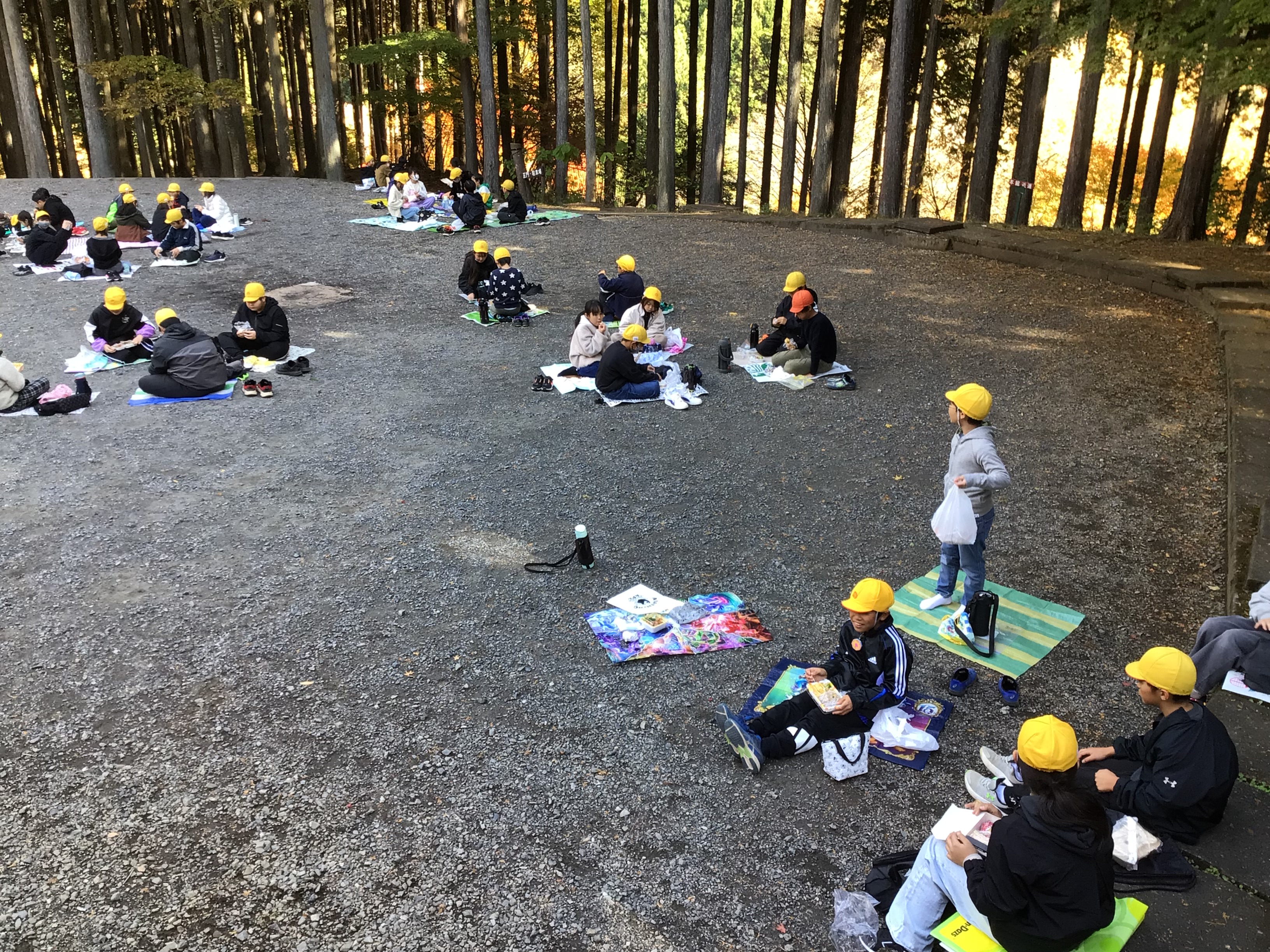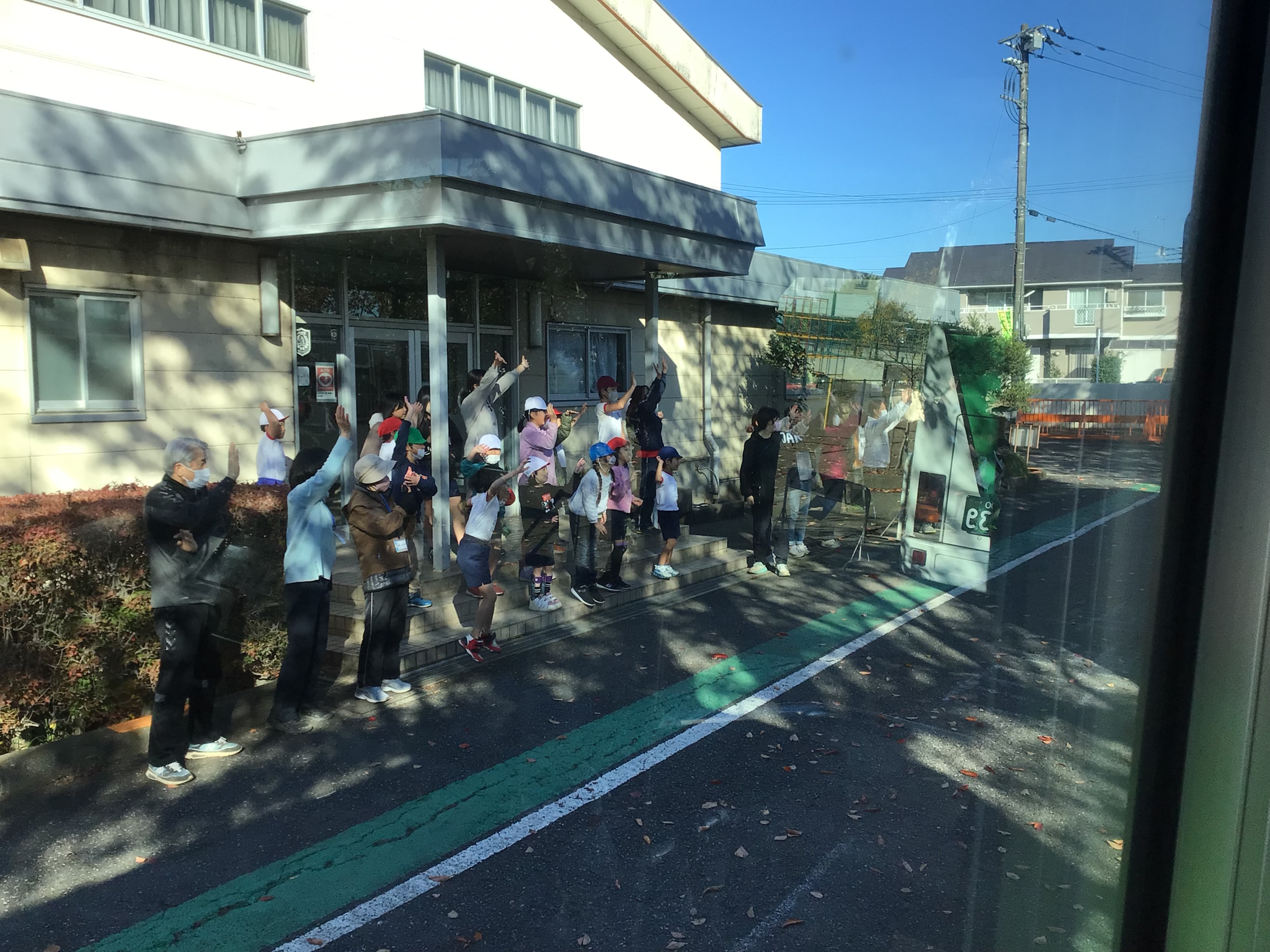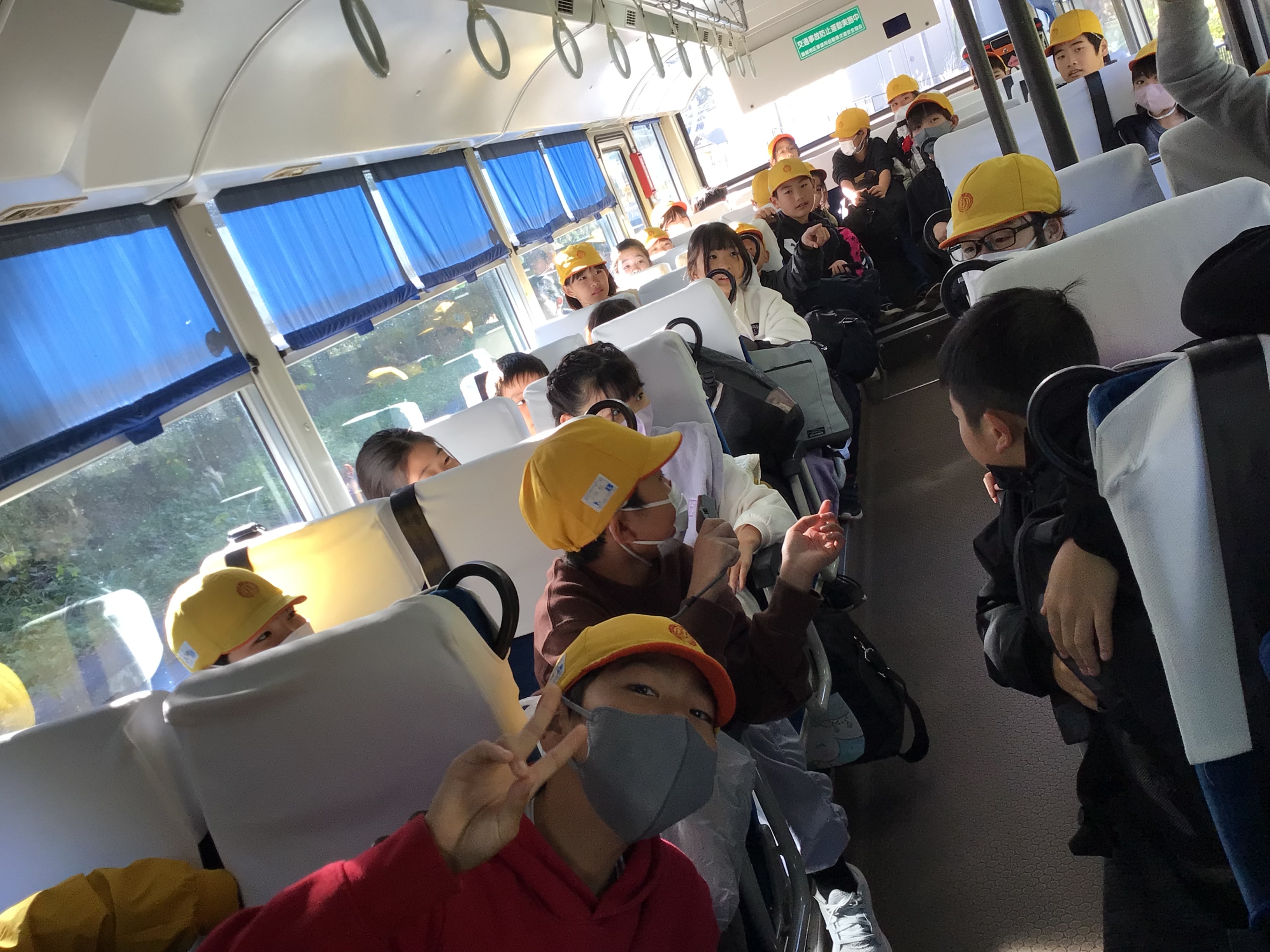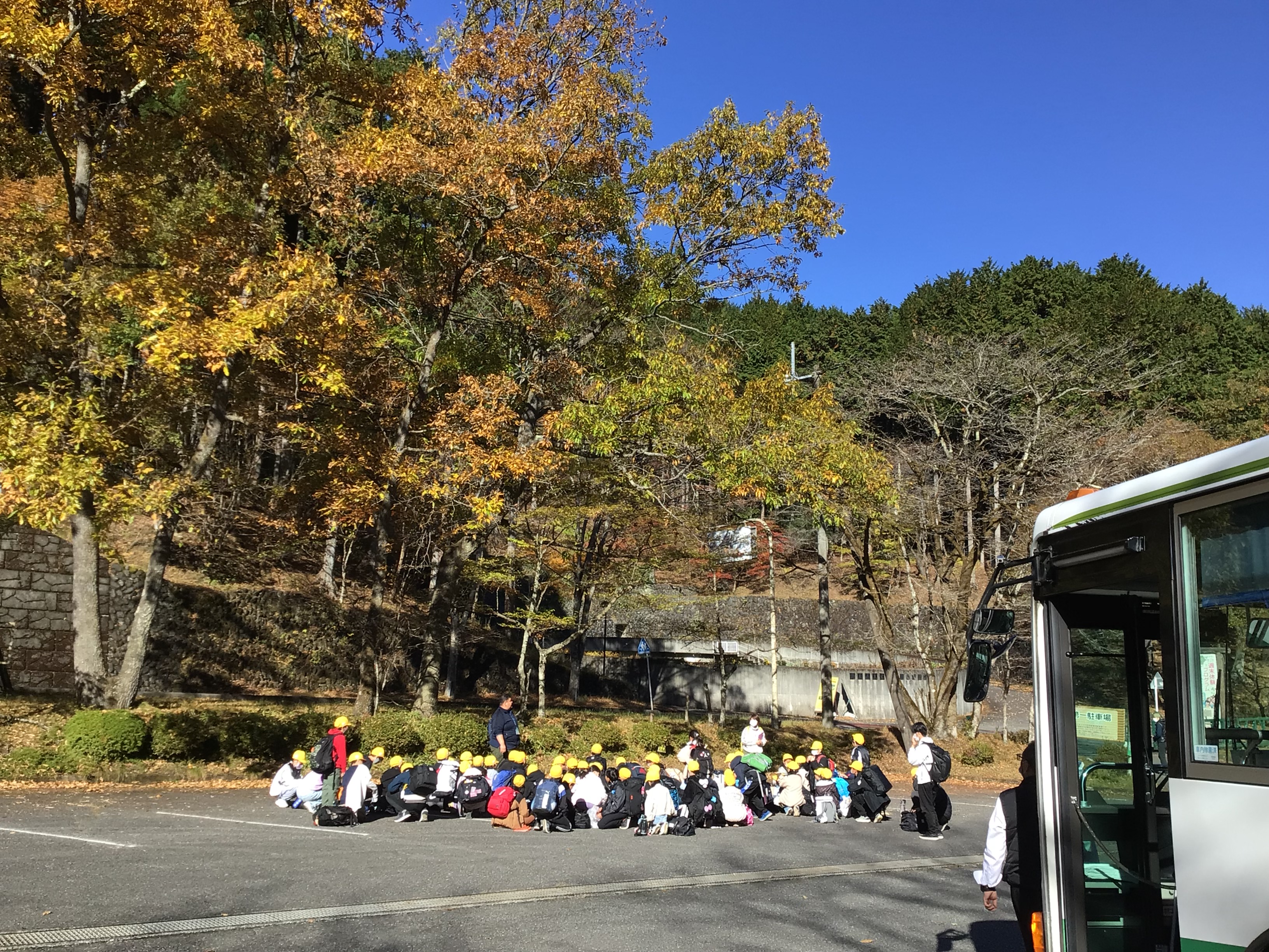 数人の欠席者がいましたが、5年宿泊学習は、晴天のもと出発します。先生がいないのに、自分たちで整列しています。