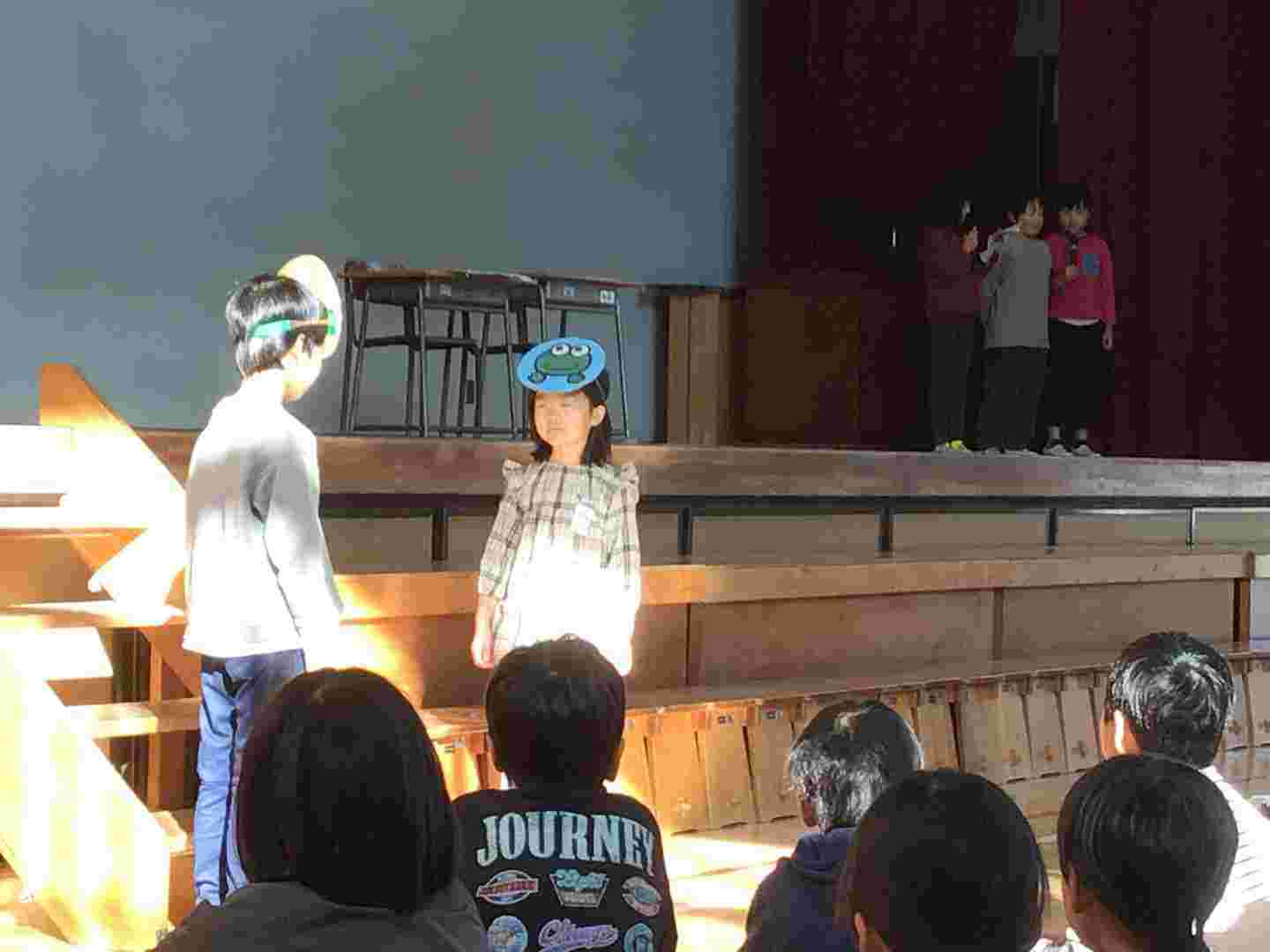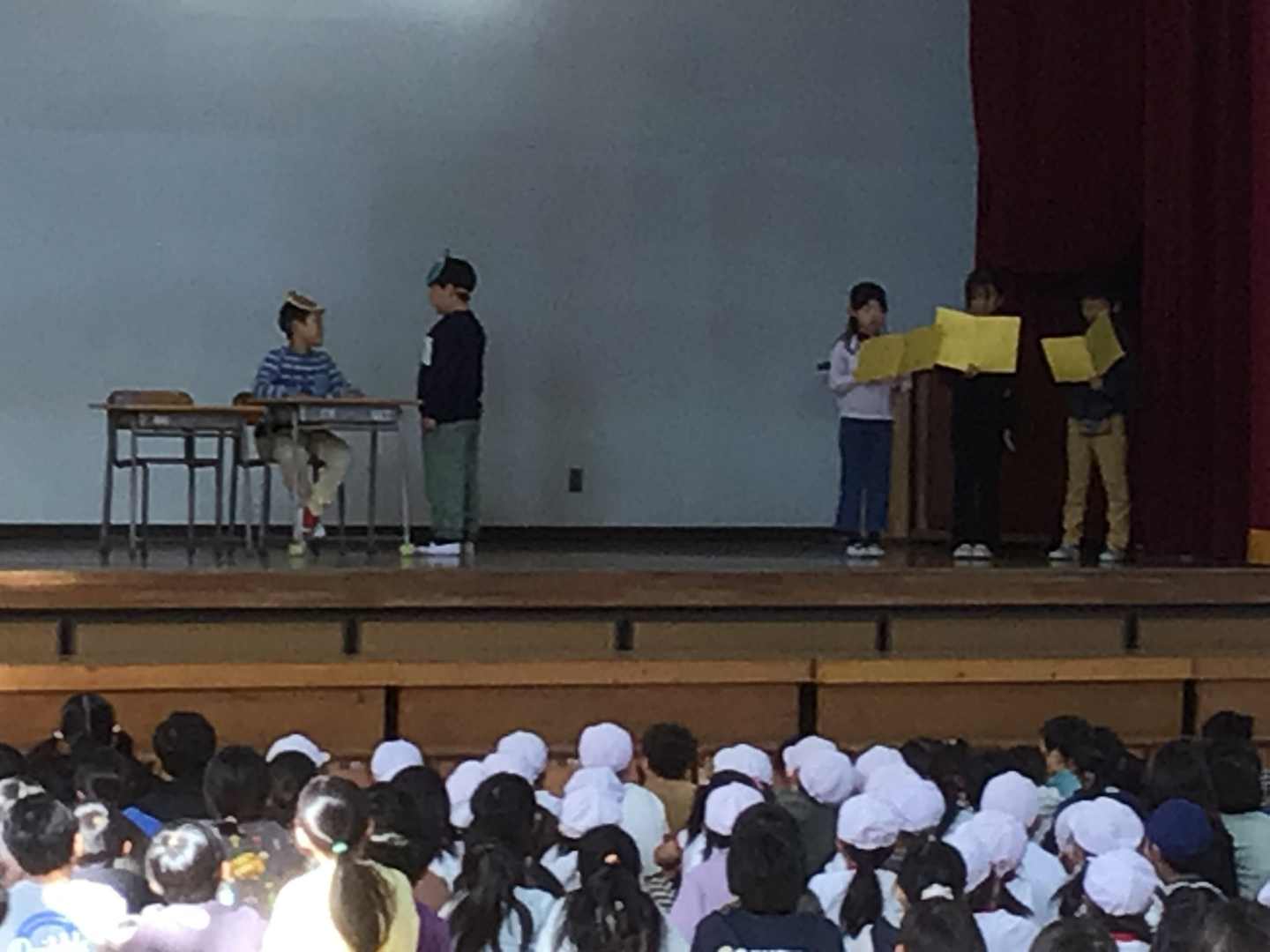 11月のお話朝会がありました。読書月間にちなんで、本の紹介をしました。その後、2年生が今月の生活目標「廊下や階段での行動について考えよう」について、劇を交えて全校児童に伝えてくれました。考えて生活してくれる子が増えてくれることでしょう。