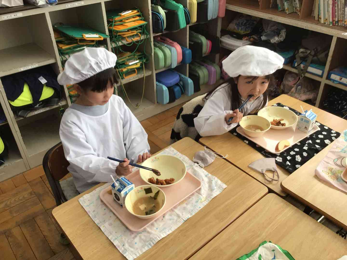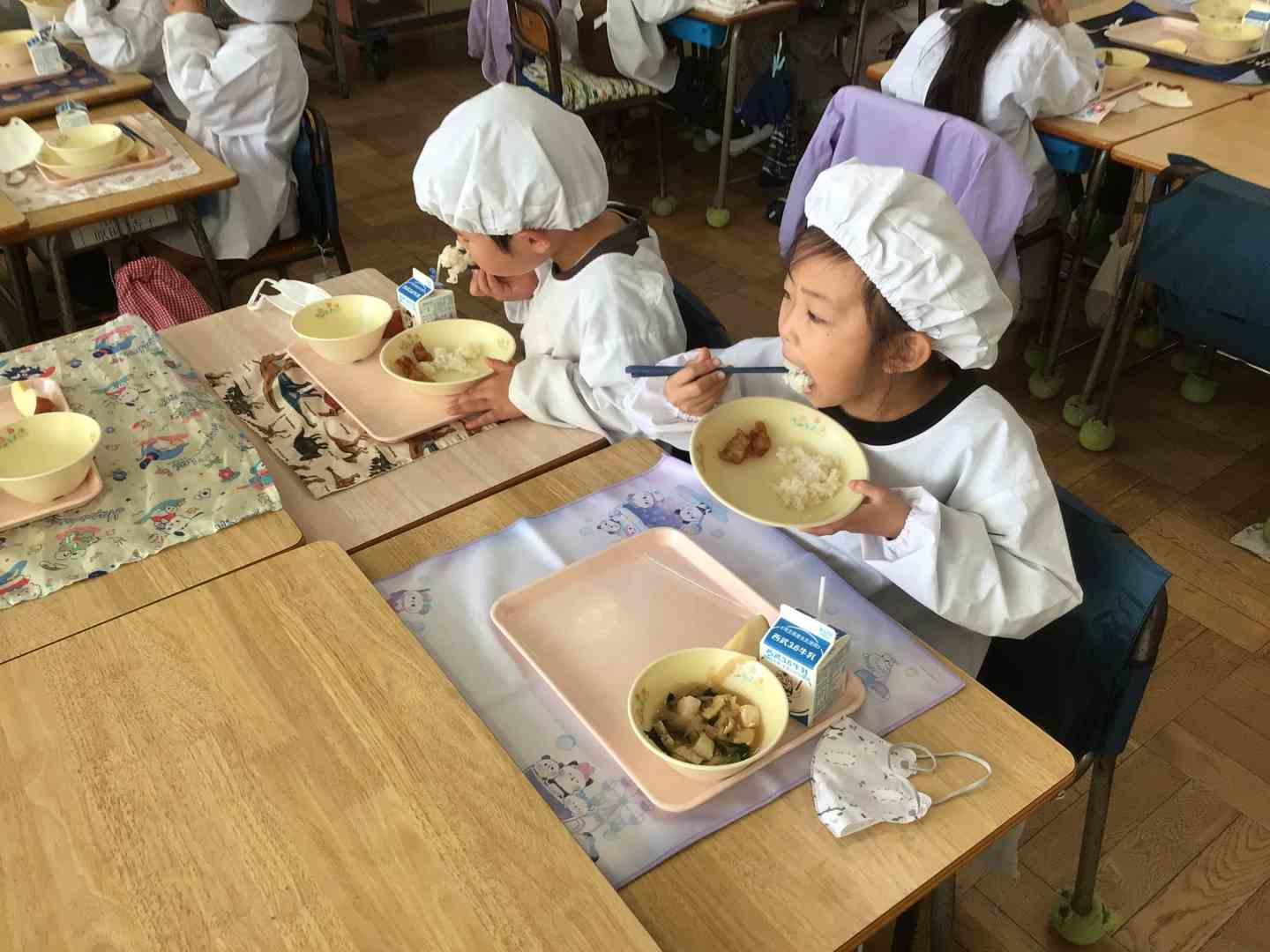 明日、11月8日は「いい歯の日」です。そのため今日の給食は、噛むことを意識して食べてほしいので「かみかみこんだて」でした。ごぼうや切り干し大根、皮がついたりんごをよく噛んで食べました。