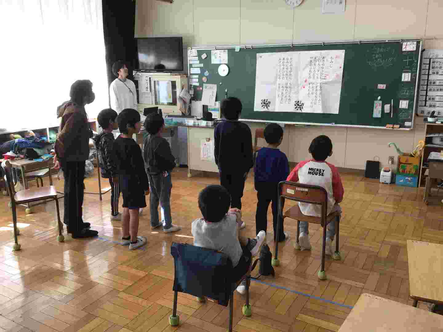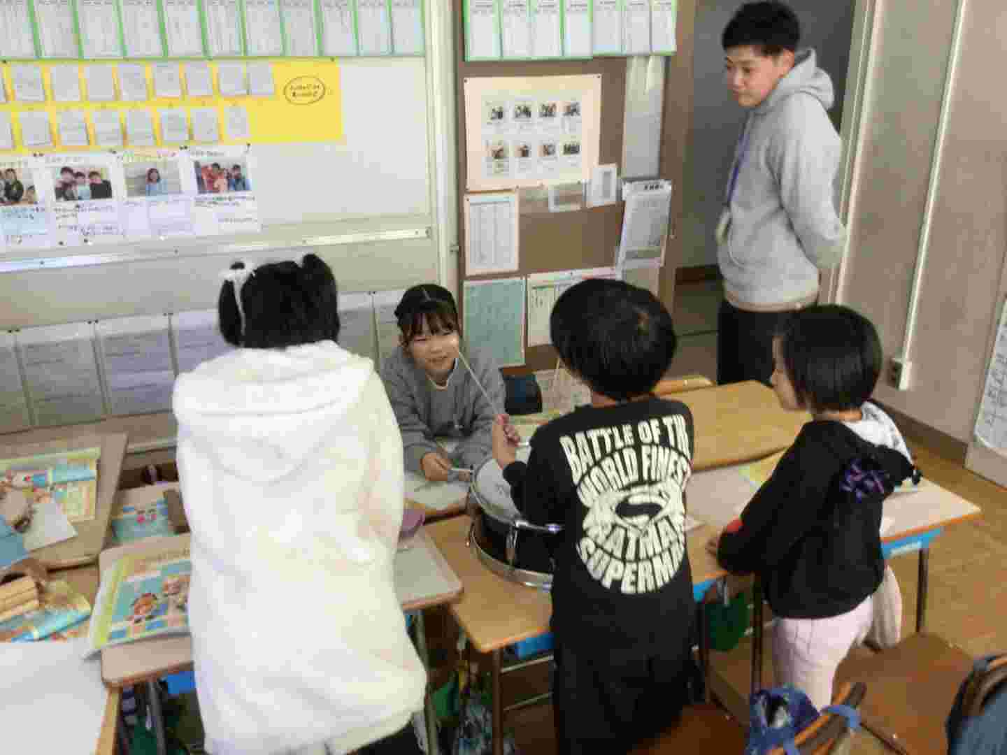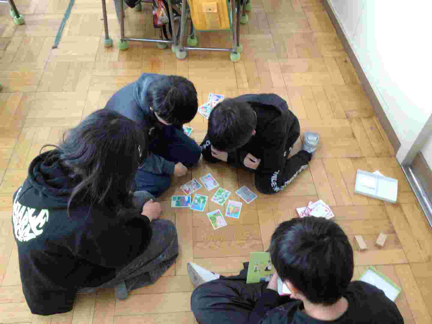 2年生の教室に行くと、音楽の授業をしていました。何やらグループで話し合いをしていました。「楽器を組み合わせて演奏しよう」というめあてでした。4年生の教室では、グループでかるたをしていました。仲よく楽しそうに進んでいました。