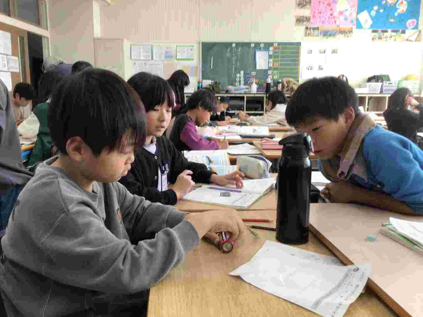 3年生の教室では、豆電球と電池を使って、「電気がつくときとつかないとき」について予想を立て、実験をしていました。電池を反対にしてつなげても電気がつくことが分かりました。