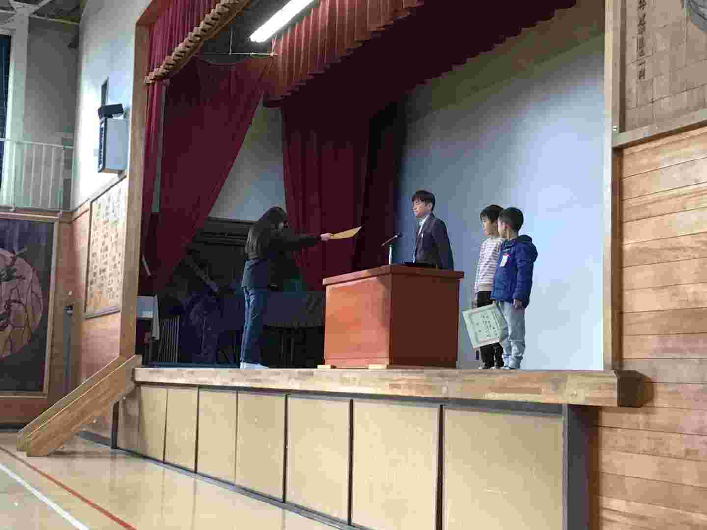 朝の時間、賞状を伝達しました。名前を呼ばれた児童は、その場に立ちます。そして代表児童が壇上に上がり、賞状をもらいます。夏休みから2学期の間、多くの児童ががんばりました。