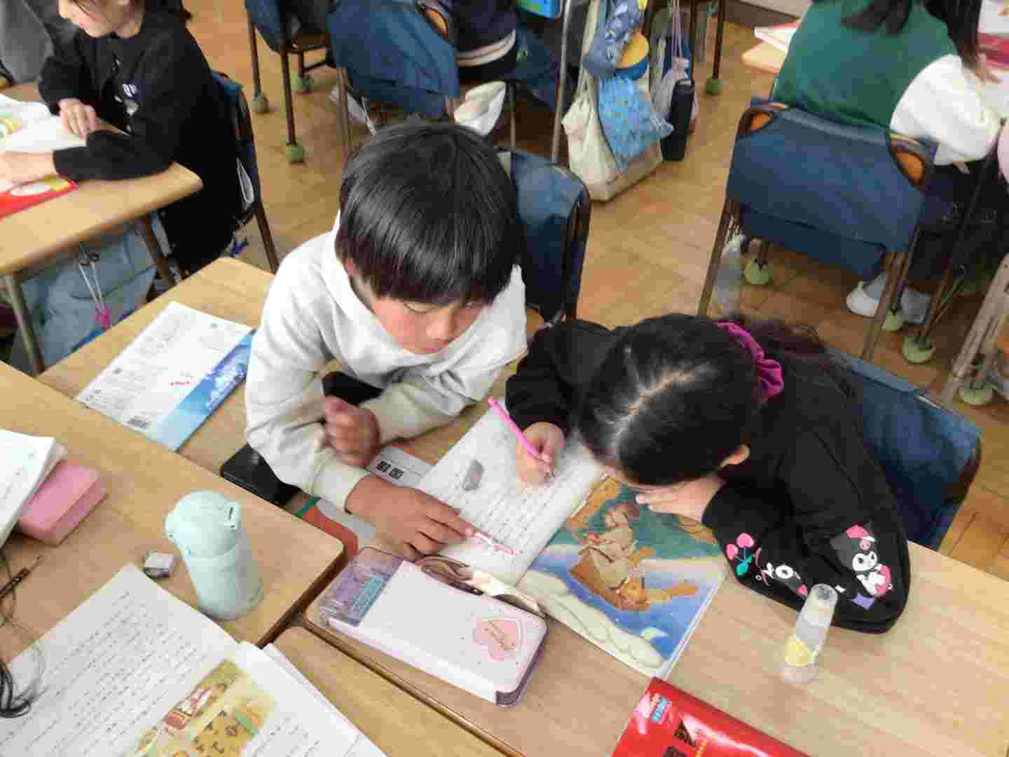 午前中、東京電力さんが、校庭の樹木を剪定してくださいました。電線にかかっていないところまで切っていただき、スッキリしました。教室では、学び合いが進んでいました。1つの教科書をペアで読み合う姿がありました。
