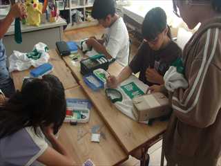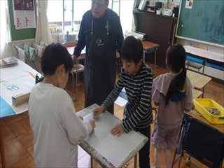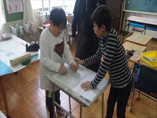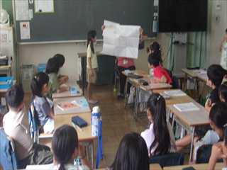 実物大で描いた道具の絵を見て、聴いているクラスのみんなが驚いていました。