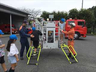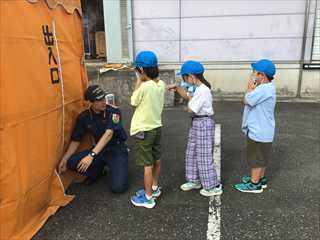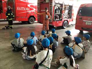 ずらりと並んだ消防自動車の説明を聞いたり、煙体験をしたりして、消防署のお仕事について学びました。