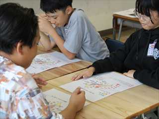 栄養教諭の先生に給食の献立づくりについて教えていただき、子供たちが栄養やバランス、材料等を考えて給食一食分の献立を考えました。