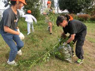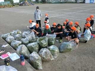 グループで力を合わせて、校庭中の草を袋いっぱいに集めて、集まった袋の数で競い合いました。