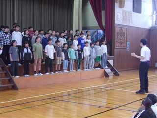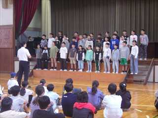 仲よし音楽会で歌う合唱曲を、全校の児童と保護者の前で発表しました。
