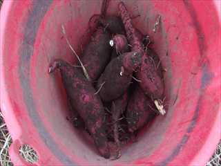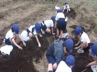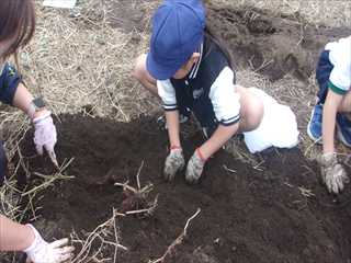 土から出た茎の周りを手で掘っていき、さつまいもが見えてくと歓声がわきました。さらに、さつまいもの周りの土を丁寧に掘って、取り上げたさつまいもに、また大きな歓声があがりました。