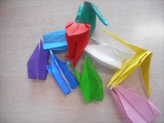 朝の時間に、縦割りグループで千羽鶴を折りました。
