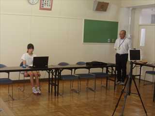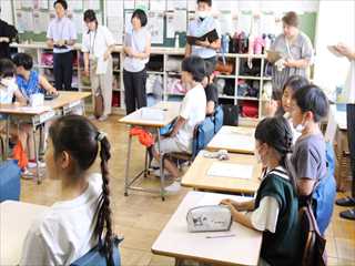 始業式後の教室では、夏休みに取り組んだ作品の紹介や思い出の発表をしていました。
