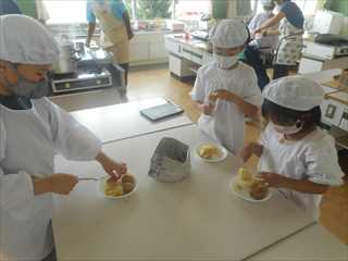 今日は、じゃがいもを使った料理に挑戦しました。熱々のじゃがいもの皮を、やけどに気を付けて丁寧にむいていました。