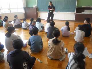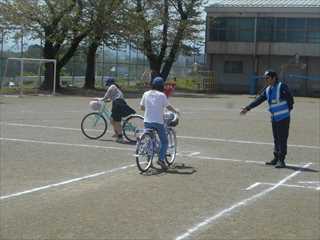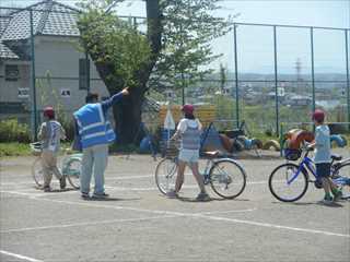 低中高学年ごとに、交通安全教室が行われました。1・2年生は横断歩道の安全な渡り方を学びました。