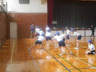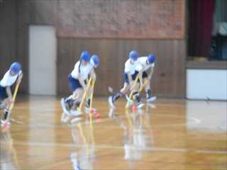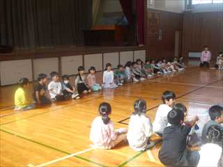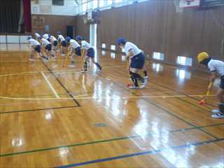 早いものでホッケー教室も3回目となりました。今日は昨日の雨で校庭が使えなかったため、体育館でのホッケーとなりました。床の上は地面とは違ったボールの滑りをしますが、6年生はすぐに対応してドリブルやパスをしていました。