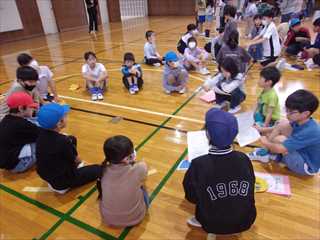 今日は、縦割り班のメンバーが初めて顔を合わせました。高学年のグループ長を中心に自己紹介をしました。
